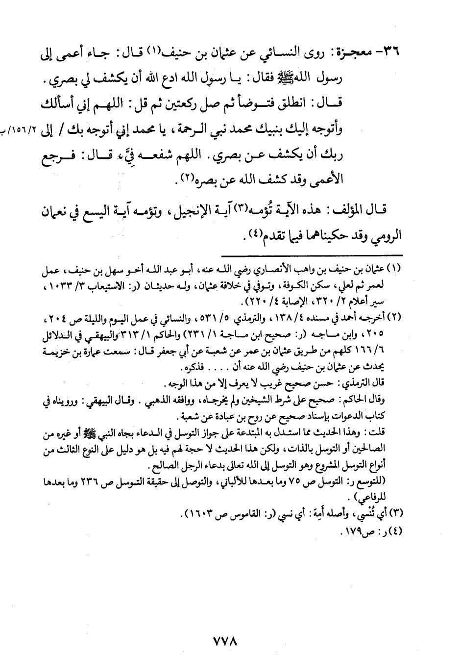 36- معجزة: روى النسائي عن عثمان1 بن حنيف، قال: جاء أعمى إلى رسول الله صلى الله عليه وسلم فقال: يا رسول الله ادع الله أن يكشف لي بصري. قال: انطلق فتوضأ ثم صل ركعتين ثم قل: اللهم إني أسألك وأتوجه إليك بنبيّك محمّد نبيّ الرحمة، يا محمّد إني أتوجه بك / (2/156/ب) إلى ربّك أن يكشف عن بصري. اللهم شفّعه فِيَّ. قال: فرجع الأعمى وقد كشف الله عنه بصره2.