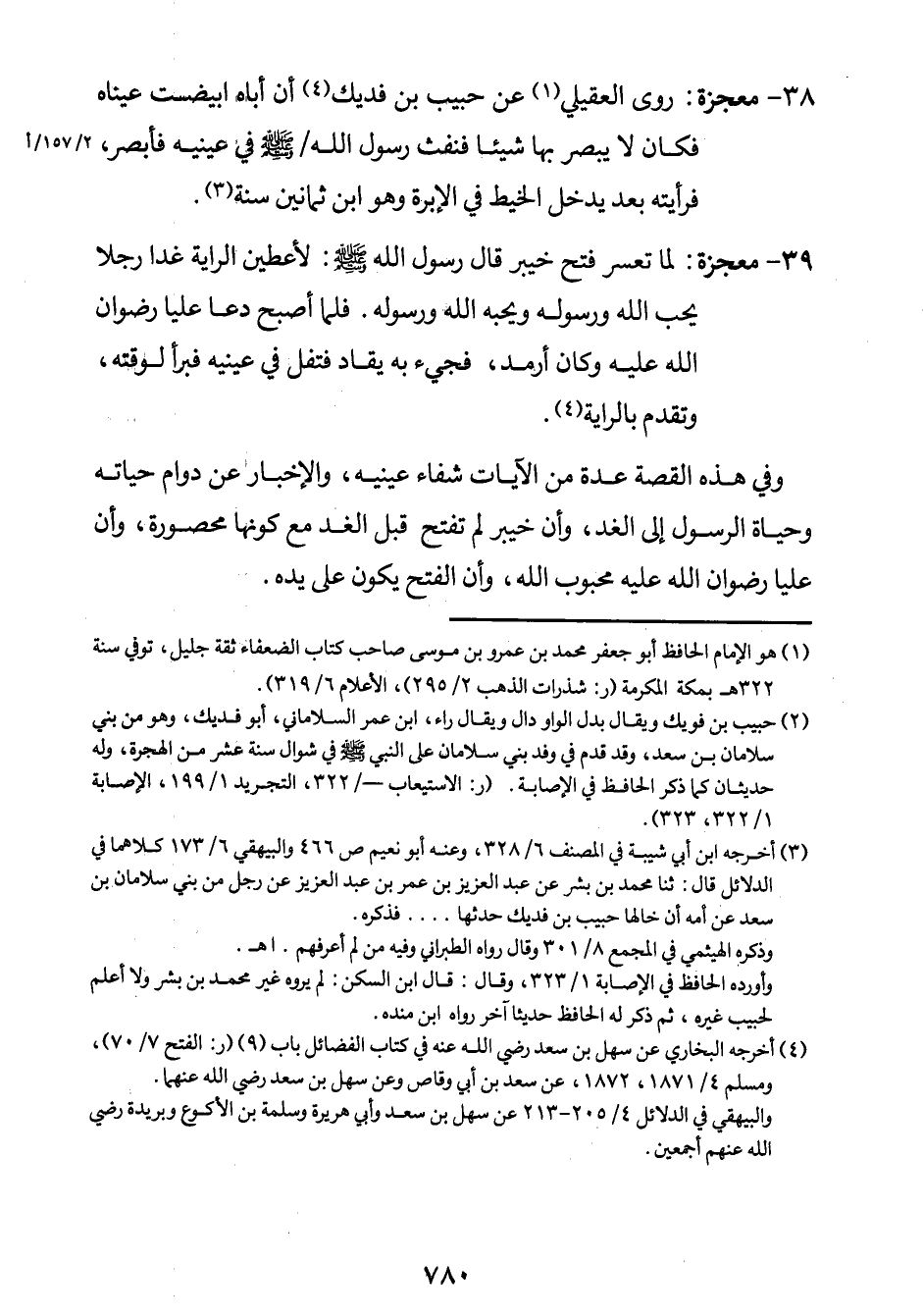 38- معجزة: روى العقيلي1 عن حبيب2 بن فديك أن أباه ابيضت عيناه فكان لا يبصر به شيئاً فنفث رسول الله صلى الله عليه وسلم/ (2/157/أ) في عينيه فأبصر، فرأيته بعد يدخل الخيط في الإبرة وهو ابن ثمانين سنة3.