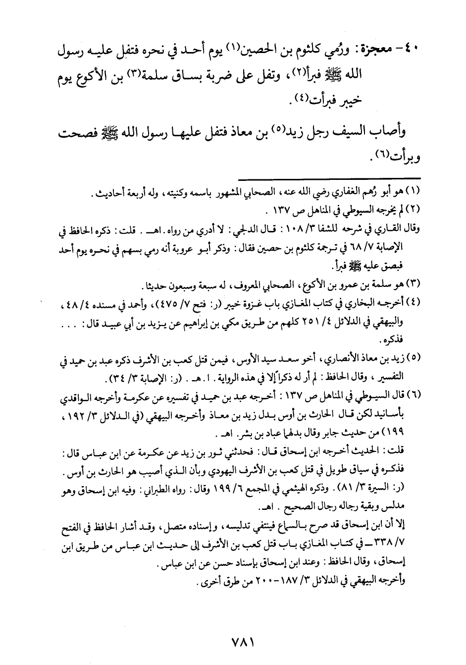 40- معجزة: ورُمي كلثوم1 بن الحصين يوم أحد في نحره فتفل عليه رسول الله صلى الله عليه وسلم فبرأ2، وتفل على ضربة بساق سلمة3 بن الأكوع يوم خيبر فبرأت4.