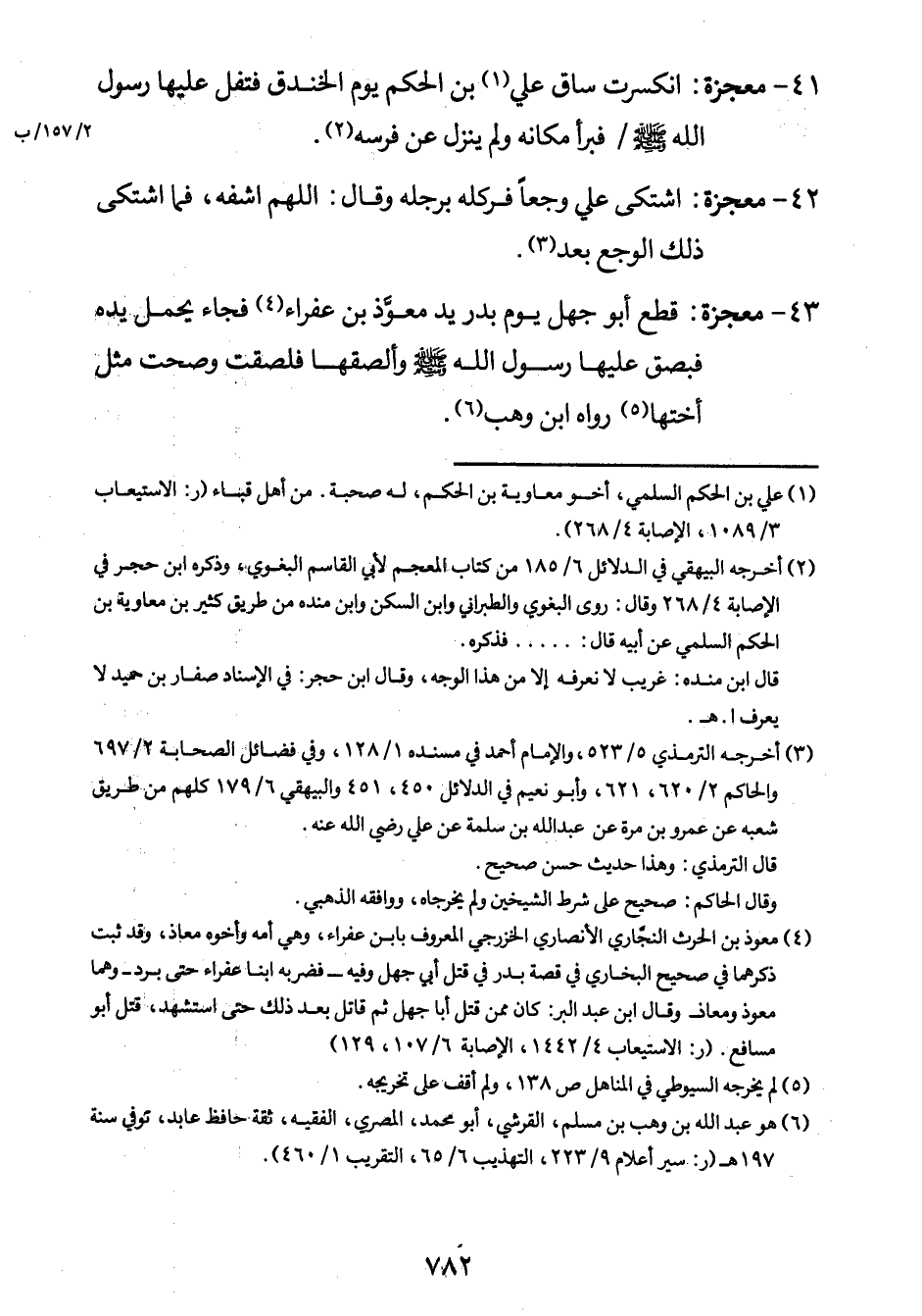 41- معجزة: انكسرت ساق عليّ1 بن الحكم يوم الخندق فتفل عليها رسول الله صلى الله عليه وسلم / (2/157/ب) فبرأ مكانه ولم ينْزل عن فرسه2.