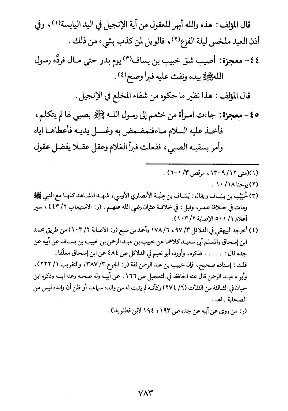 44- معجزة: أصيب شقّ خبيب3 بن يساف يوم بدر حتى مال فردّه رسول الله صلى الله عليه وسلم بيده ونفث عليه فبرأ وصحّ4.