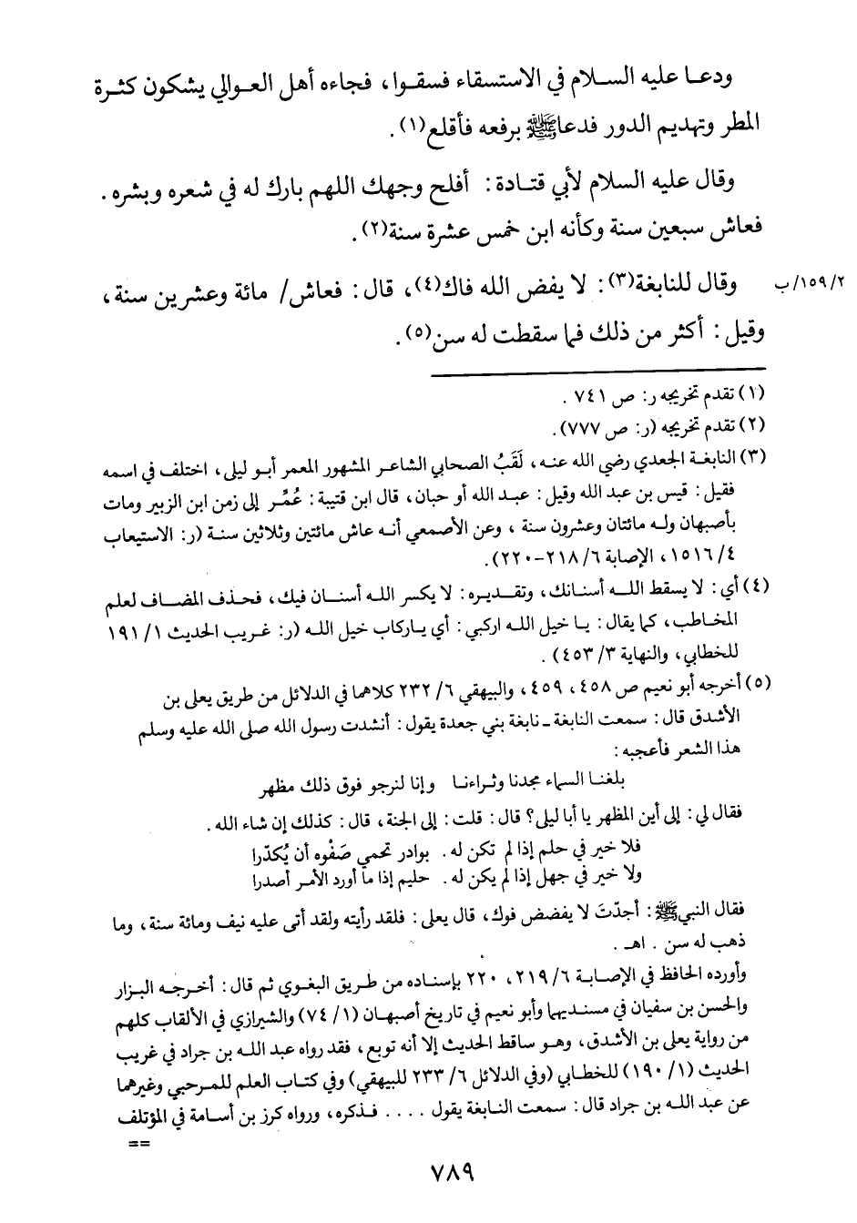 3 النابغة الجعدي رضي الله عنه، لَقَبُ الصحابي الشاعر المشهور أبو ليلى، اختلف في اسمه فقيل: قيس بن عبد الله، وقيل: عبد الله أو حبان، قال ابن قتيبة: عُمِّر إلى زمن ابن الزبير، ومات بأصبهان وله مائتان وعشرون سنة. وعن الأصمعي أنه عاش مائتين وثلاثين سنة. (ر: الاستيعاب 4/1516، الإصابة 6/218-220) .