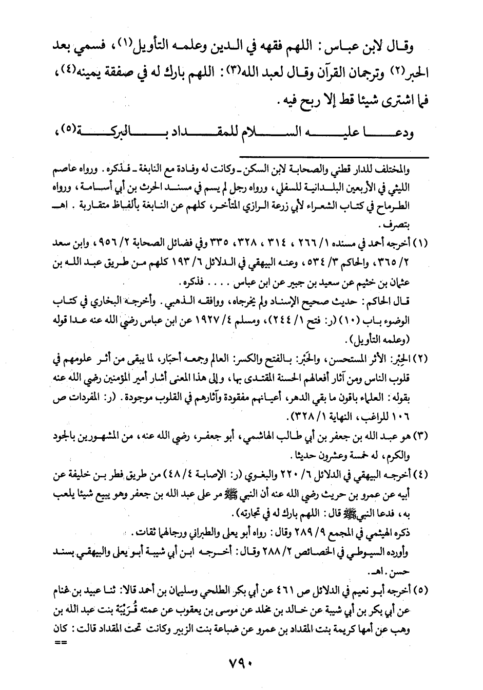 وقال لابن عباس: "اللهم فقّهه في الدين وعلّمه التأويل"1. فسمي بعد الحبر2 وترجمان القرآن. وقال لعبد الله3: "اللهم بارك له في صفقة يمينه"4، فما اشترى شيئاً إلاّ ربح فيه.