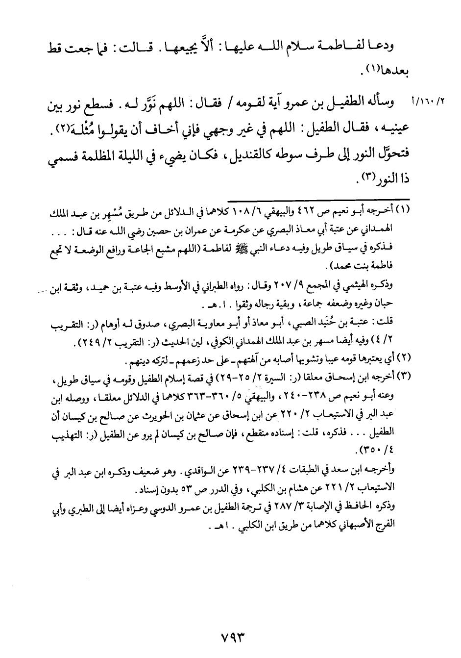 وذكره الحافظ في الإصابة 3/287، في ترجمة الطفيل بن عمرو الدوسي وعزاه أيضاً إلى الطبري وأبي الفرج الأصبهاني كلاهما من طريق ابن الكلبي". اهـ.