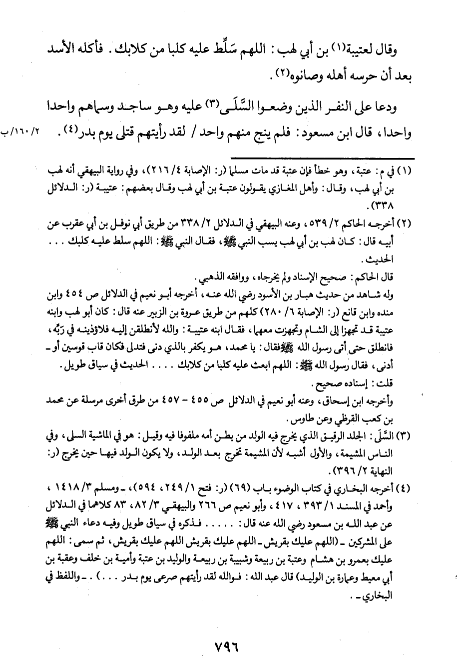 4 أخرجه البخاري في كتاب الضوء باب (69) . (ر: فتح الباري 1/249، 594) ، ومسلم 3/1418، وأحمد في المسند 1/393، 417، وأبو نعيم ص 266، والبيهقي 3/82، كلاهما في الدلائل عن عبد الله بن مسعود رضي الله عنه، قال: ... ، فذكره في سياق طويل. وفيه دعاء النبي صلى الله عليه وسلم على المشركين: "اللهم عليك بقريش - اللهم عليك بقريش اللهم عليك بقريش، ثم سمى اللهم عليك بعمرو بن هشام وعتبة بن ربيعة وشبيبة بن ربيعة والوليد بن عتبة وأمية بن خلف وعقبة بن أبي معيط وعمارة ابن الوليد".قال عبد الله: فوالله لقد رأيتهم صرعى يوم بدر ... ".واللفظ في البخاري.