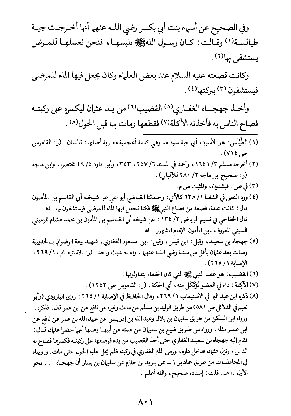4 ورد النّصّ في الشفا 1/638، كالآتي: "وحدّثنا القاضي أبو عليّ عن شيخه أبي القاسم بن المأمون، قال: كانت عندنا قصعة من قصاع النبي صلى الله عليه وسلم فكنا نجعل فيها الماء للمرضى فيستشفون بها". اهـ.