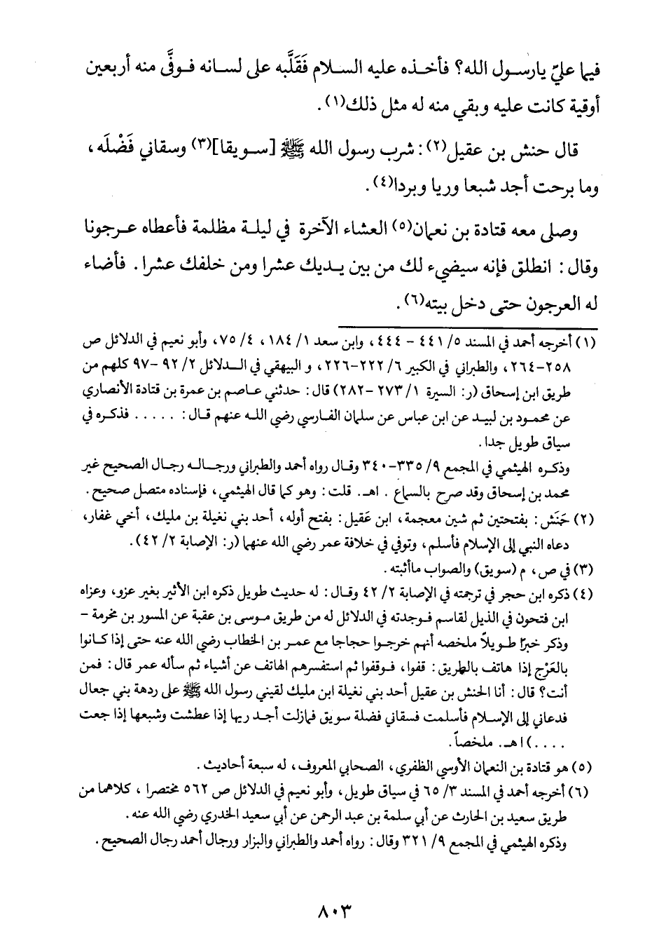 4 ذكره ابن حجر في ترجمته في الإصابة 2/42، وقال: "له حديث طويل ذكره ابن الأثير بغير عزو، وعزاه ابن فتحون في الذيل لقاسم فوجدته في الدلائل له من طريق موسى بن عقبة عن المسور بن مخرمة - وذكر خبراً طويلاً ملخصه: أنهم خرجوا حجاجاً مع عمر بن الخطاب رضي الله عنه حتى إذا كانوا بالعَرْج إذا هاتف بالطريق: قفوا. فوقفوا ثم استفسرهم الهاتف عن أشياء ثم سأله عمر قال: فمن أنت؟ قال: أنا الحنش ابن عقيل أحد بني نغيلة بن مليك لقيني رسول الله صلى الله عليه وسلم على ردهة بني جعال فدعاني إلى الإسلام فأسلمت فسقاني فضلة سويق فما زلت أجد ريها إذا عطشت وشبعها إذا جعت ... "، اهـ. ملخصاً.