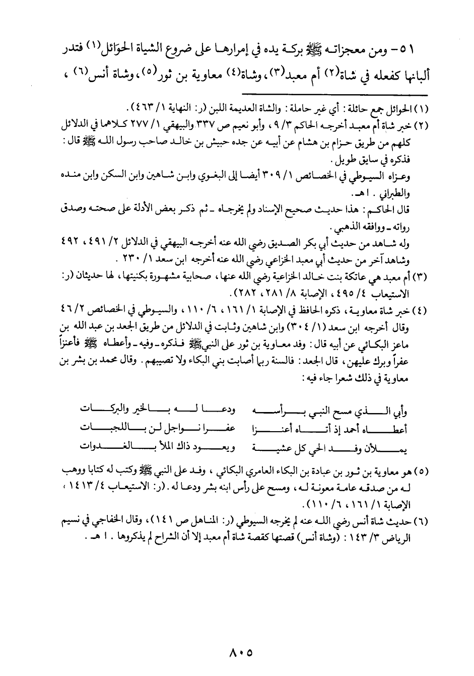51- ومن معجزاته صلى الله عليه وسلم بركة يده في إمرارها على ضروع الشياة الحوَائل1 فتدر ألبانها كفعله في شاة2 أم3 معبد. وشاة4 معاوية5بن ثور، وشاة6 أنس،