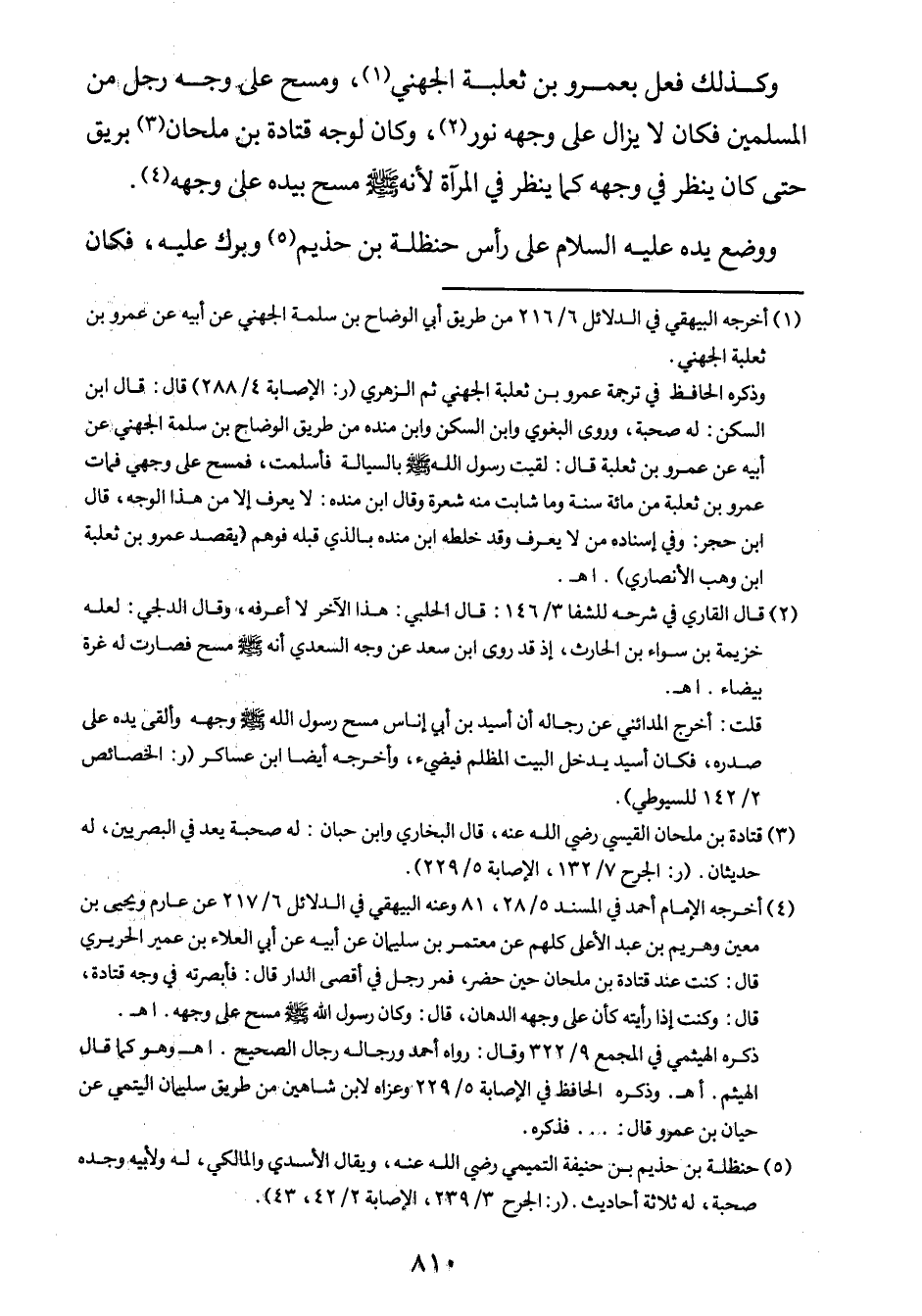 4 أخرجه الإمام أحمد في المسند 5/28، 81، وعنه البيهقي في الدلائل 6/217، عن عارم ويحيى بن معين وهريم بن عبد الأعلى كلهم عن معتمر بن سليمان عن أبيه عن أبي العلاء بن عمير الحريري، قال: كنت عند قتادة بن ملحان حين حضر، فمر رجل في أقصى الدار، قال: فأبصرته في وجه قتادة، قال: وكنت إذا رأيته كأن على وجهه الدهان. قال: وكان رسول الله صلى الله عليه وسلم مسح على وجهه". اهـ.