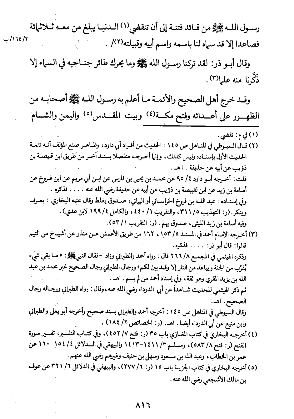 رسول الله صلى الله عليه وسلم من قائد فتنة إلى أن تنقضي1 الدنيا يبلغ من معه ثلاثمائة فصاعداً إلاّ قد سمّاه لنا باسمه واسم أبيه وقبيلته2. (/ (2/164/ب) .