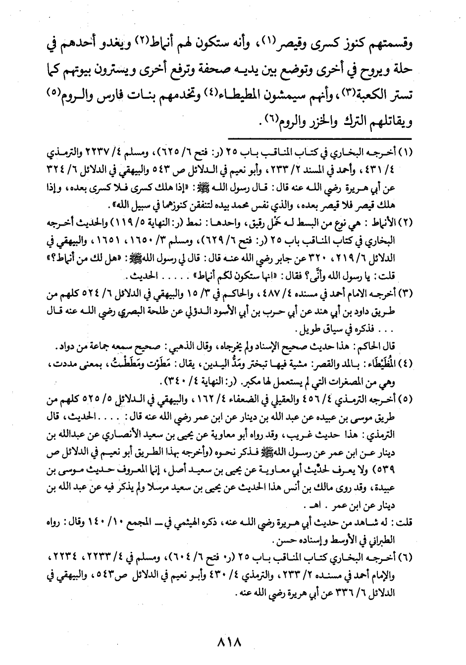 1 أخرجه البخاري في كتاب المناقب باب (25) . (ر: فتح الباري 6/625) ، ومسلم 4/2237، والترمذي 4/431، وأحمد في المسند 2/233، وأبو نعيم في الدلائل ص 543، والبيهقي في الدلائل 6/324، عن أبي هريرة رضي الله عنه، قال: قال رسول الله صلى الله عليه وسلم: "إذا هلك كسرى فلا كسرى بعده، وإذا هلك قيصر فلا قيصر بعده، والذي نفس محمّد بيده لتنفقن كنوزهما في سبيل الله".