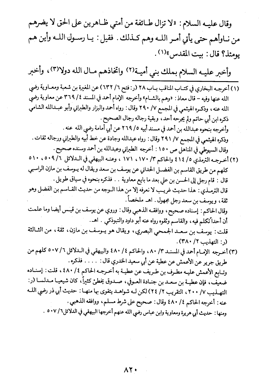 وقال عليه السلام: "لا تزال طائفة من أمّتي ظاهرة على الحقّ لا يضرّهم من ناوأهم حتى يأتي أمر الله وهم كذلك. فقيل: يا رسول الله وأين هم يومئذٍ؟. قال: بيت المقدس" 1.