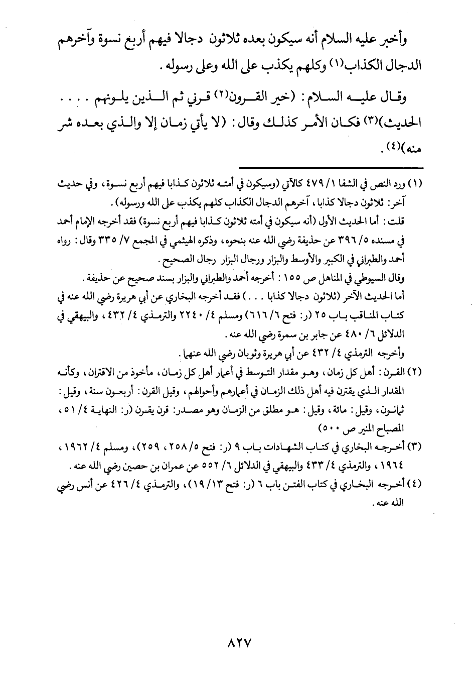 1 ورد النص في الشفا 1/479، كالآتي: "وسيكون في أمته ثلاثون كذّاباً فيهم أربع نسوة، وفي حديث آخر: ثلاثون دجّالاً كذّاباً، آخرهم الدّجّال الكذّاب كلهم يكذب على الله ورسوله".