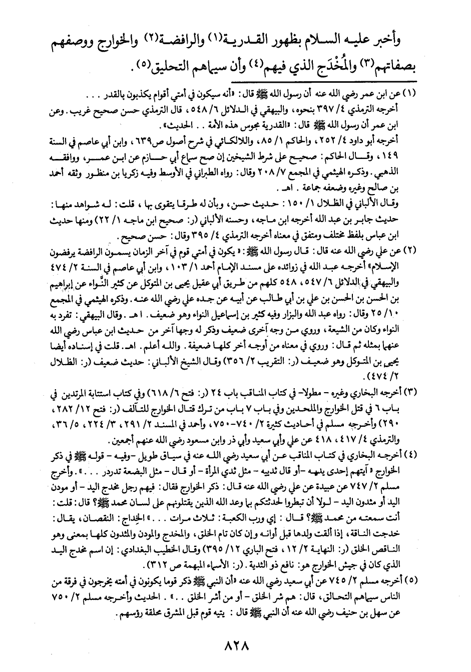 وأخبر عليه السلام بظهور القدرية1 والرافضة2 والخوارج ووصفهم بصفاتهم3 والمُخْدَج الذي فيهم4، وأن سيماهمالتحليق5.