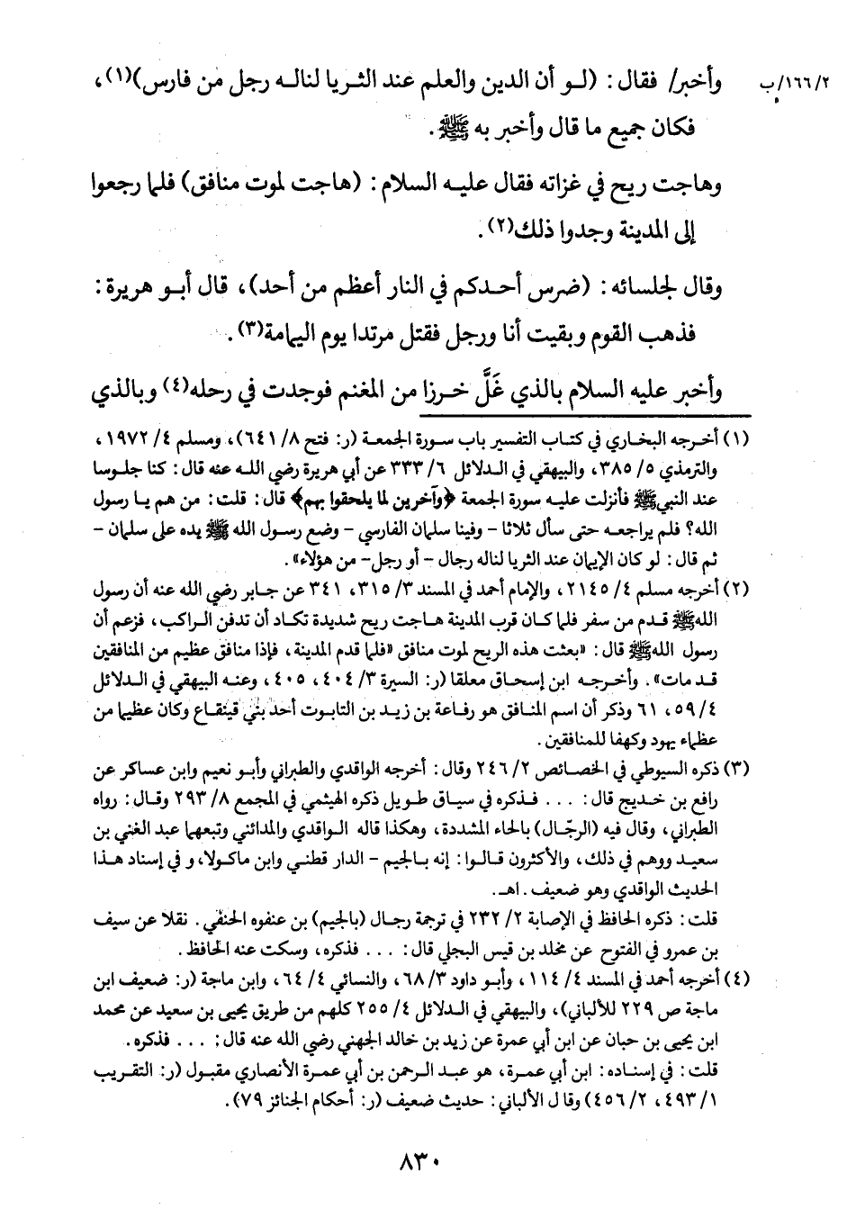 وأخبر / (2/166/ب) فقال: "لو أن الدين والعلم عند الثريا لنالهرجل من فارس"1. فكان جميع ما قال وأخبر به صلى الله عليه وسلم.