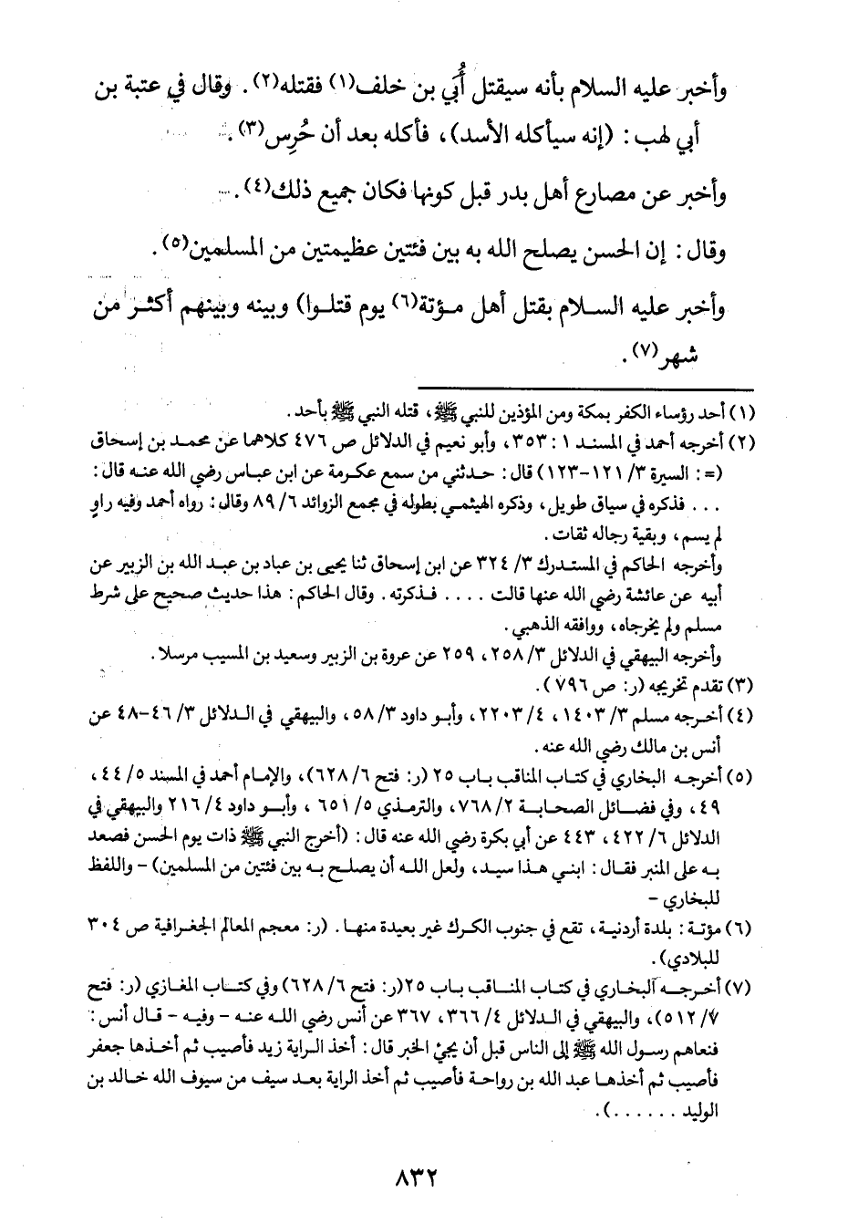 5 أخرجه البخاري في كتاب المناقب باب (25) . (ر: فتح الباري 6/628) ، والإمام أحمد في المسند 5/44، 49، وفي فضائل الصحابة 2/768، والترمذي 5/651، وأبو داود 4/216، والبيهقي في الدلائل 6/422، 443، عن أبي بكرة رضي الله عنه قال: "أخرج النبي صلى الله عليه وسلم ذات يوم الحسن فصعد به على المنبر فقال: "ابني هذا سيّد، ولعلّ الله أن يصلح به بين فئتين من المسلمين". - واللفظ للبخاري -.