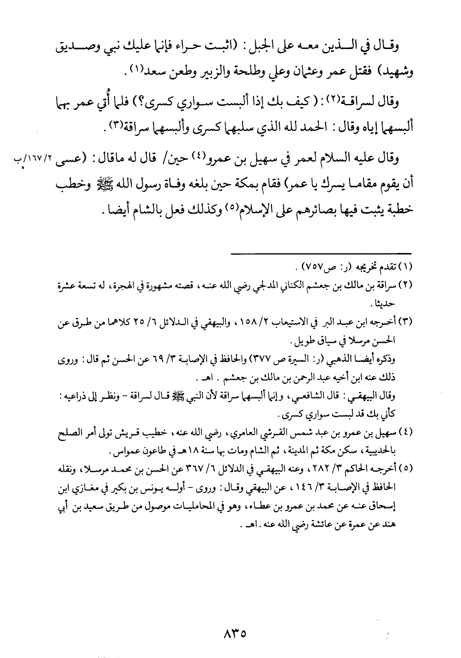 وقال في الذين معه على الجبل: "اثبت حراء، فإنما عليك نبيّ وصدّيق وشهيد". فقتل عمر وعثمان وعليّ وطلحة والزبير وطعن سعد1.