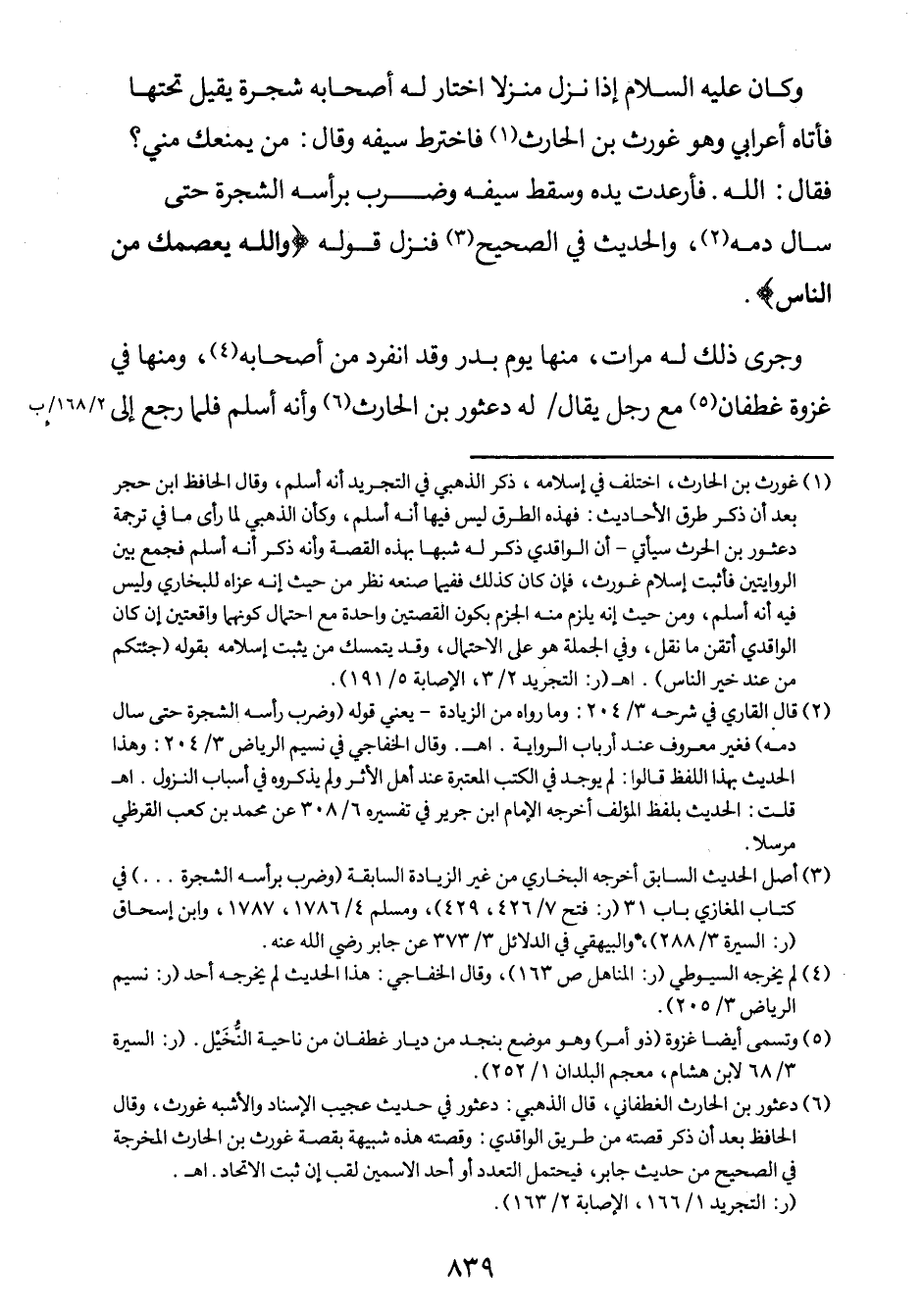 وكان عليه السلام إذا نزل منْزلاً اختار له أصحابه شجرة يقيل تحتها فأتاه أعرابي وهو غورث1 بن الحارث فاخترط سيفه، وقال: من يمنعك مني؟ فقال: الله. فأرعدت يده وسقط سيفه وضرب برأسه الشجرة حتى سال دمه2.