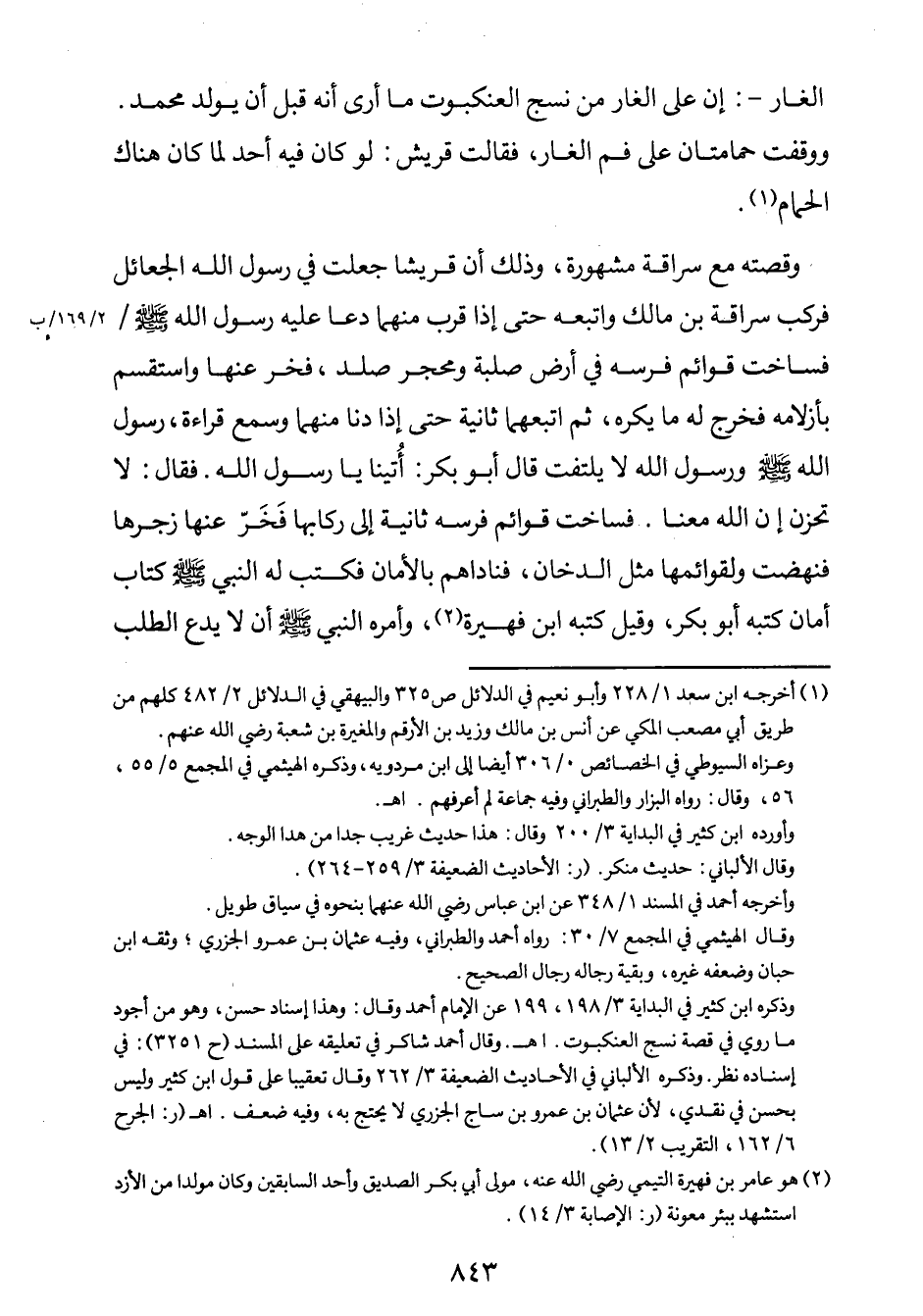 وقصته مع سراقة مشهورة، وذلك أن قريشاً جعلت في رسول الله الجعائل فركب سراقة بن مالك واتبعه حتى إذا قرب منهما دعا عليه رسول الله صلى الله عليه وسلم / (2/169/ب) فساخت قوائم فرسه في أرض صلبة ومحجر صلد، فخر عنها واستقسم بأزلامه فخرج له ما يكره، ثم اتبعهما ثانية حتى إذا دنا منهما وسمع قراءة رسول الله صلى الله عليه وسلم ورسول الله لا يلتفت قال أبو بكر: أُتينا يا رسول الله. فقال: {لا تَحْزَنْ إِنَّ اللَّهَ مَعَنَا} . [التوبة: من الآية40] . فساخت قوائم فرسه ثانية إلى ركابها فَخَرّ عنها زجرها فنهضت ولقوائمهما مثل الدخان. فناداهم بالأمان فكتب له النبي صلى الله عليه وسلم كتاب أمان كتبه أبو بكر، وقيل: كتبه ابن2 فهيرة. وأمره النبي صلى الله عليه وسلم أن لا يدع الطلب