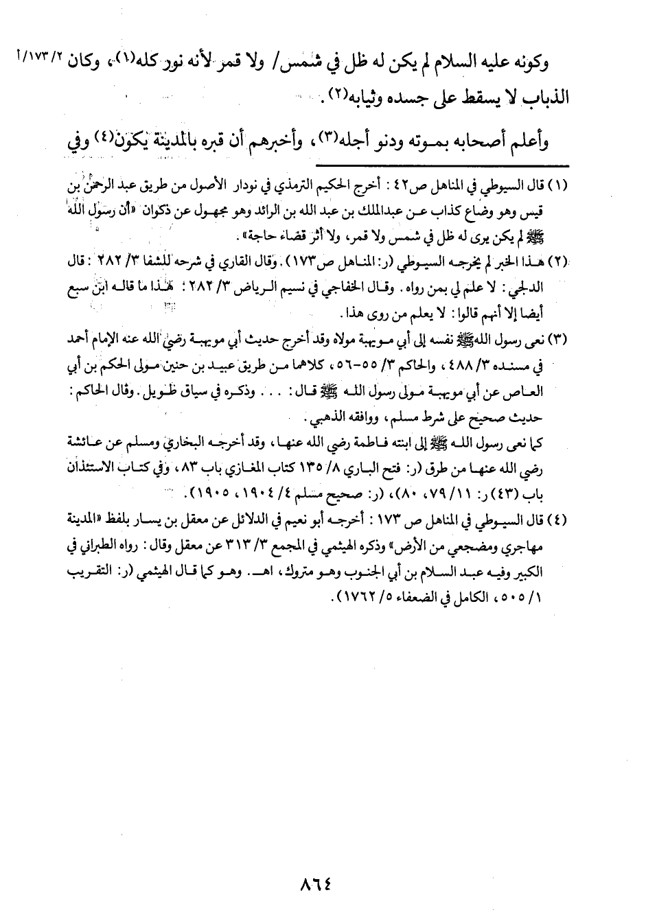1 قال السيوطي في المناهل ص 42: "أخرج الحكيم الترمذي في نوادر الأصول، من طريق عبد الرحمن بن قيس وهو وضاع كذاب عن عبد الملك بن الرائد وهو مجهول عن ذكوان أن رسول الله صلى الله عليه وسلم لم يكن يرى له ظل في شمس ولا قمر، ولا أثر قضاء حاجة".