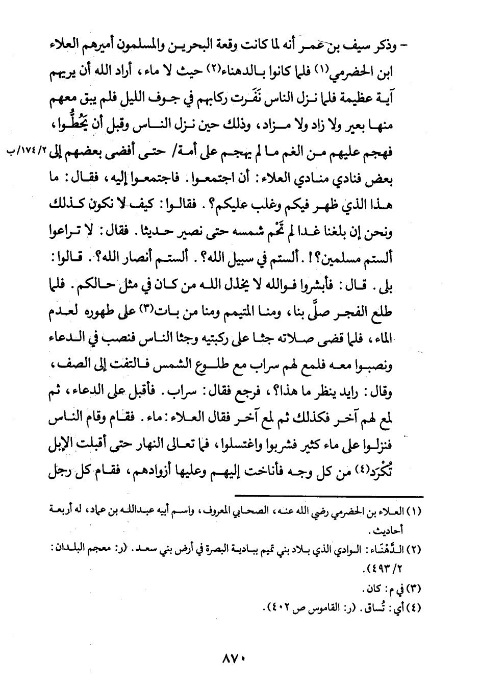 - وذكر سيف بن عمر أنه لما كانت وقعة البحرين والمسلمون أميرهم العلاء1 بن الحضرمي فلما كانوا بالدهناء2 حيث لا ماء أراد الله أن يريهم آية عظيمة فلما نزل الناس نَفَرت ركابهم في جوف الليل فلم يبق معهم منها بعير إلاّ زاد ولا مزاد، وذلك حين نزل الناس وقبل أن يَحُطُّوا، فهجم عليهم من الغم ما لم يهجم على أمة / (2/174/ب) حتى أفضى بعضهم إلى بعض فنادى منادي العلاء: أن اجتمعوا. فاجتمعوا إليه، فقال: ما هذا الذي ظهر فيكم وغلب عليكم؟ فقالوا: كيف لا نكون كذلك ونحن إن بلغنا غدالم تَحْم شمسه حتى نصير حديثاً. فقال: لا تراعوا ألستم مسلمين؟ ألستم في سبيل الله؟ ألستم أنصار الله؟ قالوا: بلى. قال: فأبشروا فوالله لا يخذل الله من كان في مثل حالكم. فلما طلع الفجر صلّى بنا، ومنا المتيمم ومنا من بات3 على طهوره لعدم الماء، فلما قضى صلاته جثا على ركبتيه وجثا الناس فنصب في الدعاء ونصبوا معه فلمع لهم سراب مع طلوع الشمس فالتفت إلى الصفّ، وقال: رايد ينظر ما هذا؟ فرجع فقال: سراب. فأقبل على الدعاء، ثم لمع لهم آخر فكذلك ثم لمع آخر فقال العلاء: ماء. فقام وقام الناس فنَزلوا على ماء كثير فشربوا واغتسلوا، فما تعالى النهار حتى أقبلت الإبل تُكْرَد4 من كل وجه فأناخت إليهم وعليها أزوادهم، فقام كل رجل