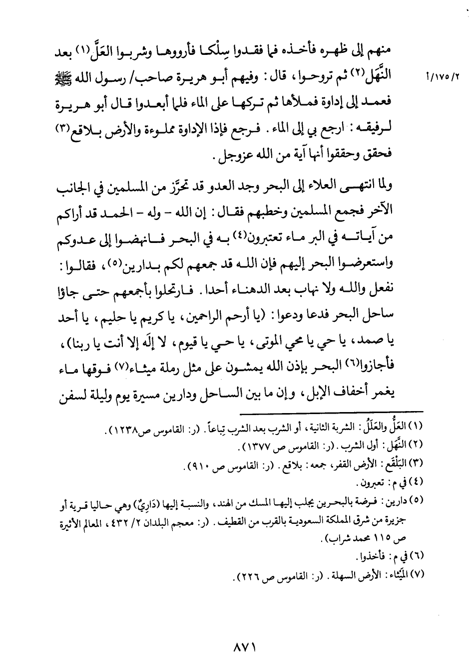 - ولما انتهى العلاء إلى البحر وجد العدوّ قد تحرَّز من المسلمين في الجانب الآخر فجمع المسلمين وخطبهم فقال: إن الله - وله - الحمد قد أراكم من آياته في البر ماء تعتبرون4 به في البحر فانهضوا إلى عدوّكم واستعرضوا البحر إليهم فإن الله قد جمعهم لكم بدارين5، فقالوا: نفعل والله ولا نهاب بعد الدهناء أحداً. فارتحلوا بأجمعهم حتى جاءوا ساحل البحر فدعا ودعوا: "يا أرحم الراحمين، يا كريم يا حليم، يا أحد يا صمد، يا حيّ يا محيي الموتى، يا حيّ يا قيوم، لا إلهَ إلاّ أنت يا ربنا". فأجازوا6 البحر فإذن الله يمشون على مثل رملة ميثاء7 فوقها ماء يغمر أخفاف الإبل، وإن ما بين الساحل ودارين مسيرة يوم وليلة لسفن