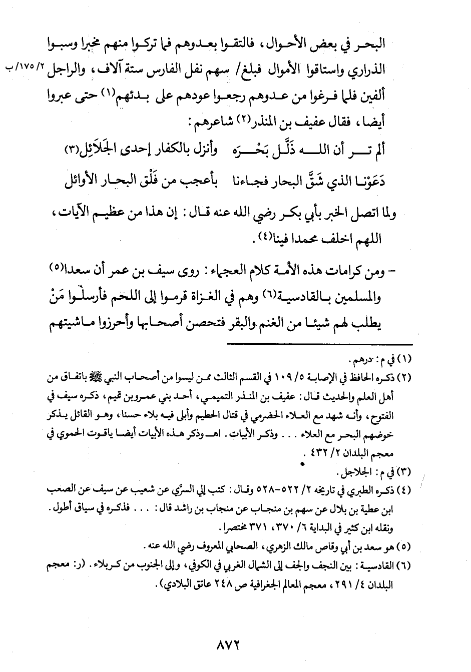 2 ذكره الحافظ في الإصابة 5/109، في القسم الثالث ممن ليسوا من أصحاب النبي صلى الله عليه وسلم باتّفاق من أهل العلم والحديث، قال: "عفيف بن المنذر التميمي، أحد بني عمرو بن تميم، ذكره سيف في الفتوح، وأنه شهد مع العلاء الحضرمي في قتال الحطيم وأبلى فيه بلاء حسناً، وهو القاتل يذكر خوضهم البحر مع العلاء ... ، وذكر الأبيات. اهـ. وذكر هذه الأبيات أيضاً ياقوت الحموي في معجم البلدان 2/432.