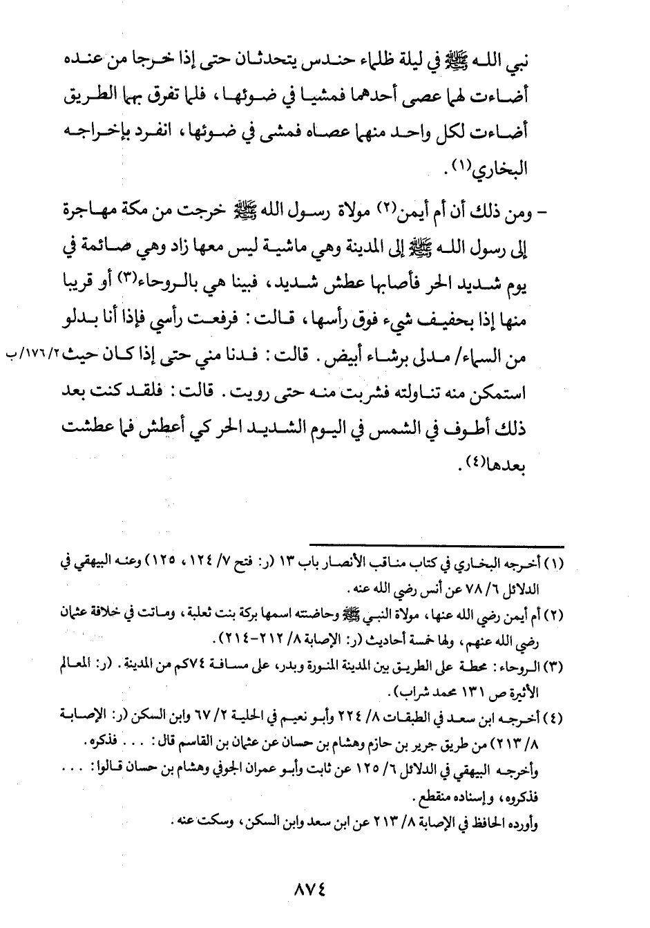 - ومن ذلك أن أم2 أيمن مولاة خرجت من مكّة مهاجرة إلى رسول الله صلى الله عليه وسلم إلى المدينة وهي ماشية ليس معها زاد وهي صائمة في يوم شديد الحرّ فأصابها عطش شديد، فبينا هي بالروحاء3 أو قريباً منها إذا بحفيف شيء فوق رأسها، قالت: فرفعت رأسي فإذا أنا بدلو من السماء / (2/176/ب) مدلى برشاء أبيض. قالت: فدنا مني حتى إذا كان حيث استمكن منه تناولته فشربت منه حتى رويت. قال: فلقد كنت بعد ذلك أطول في الشمس في اليوم الشديد الحركي أعطش فما عطشت بعدها4.
