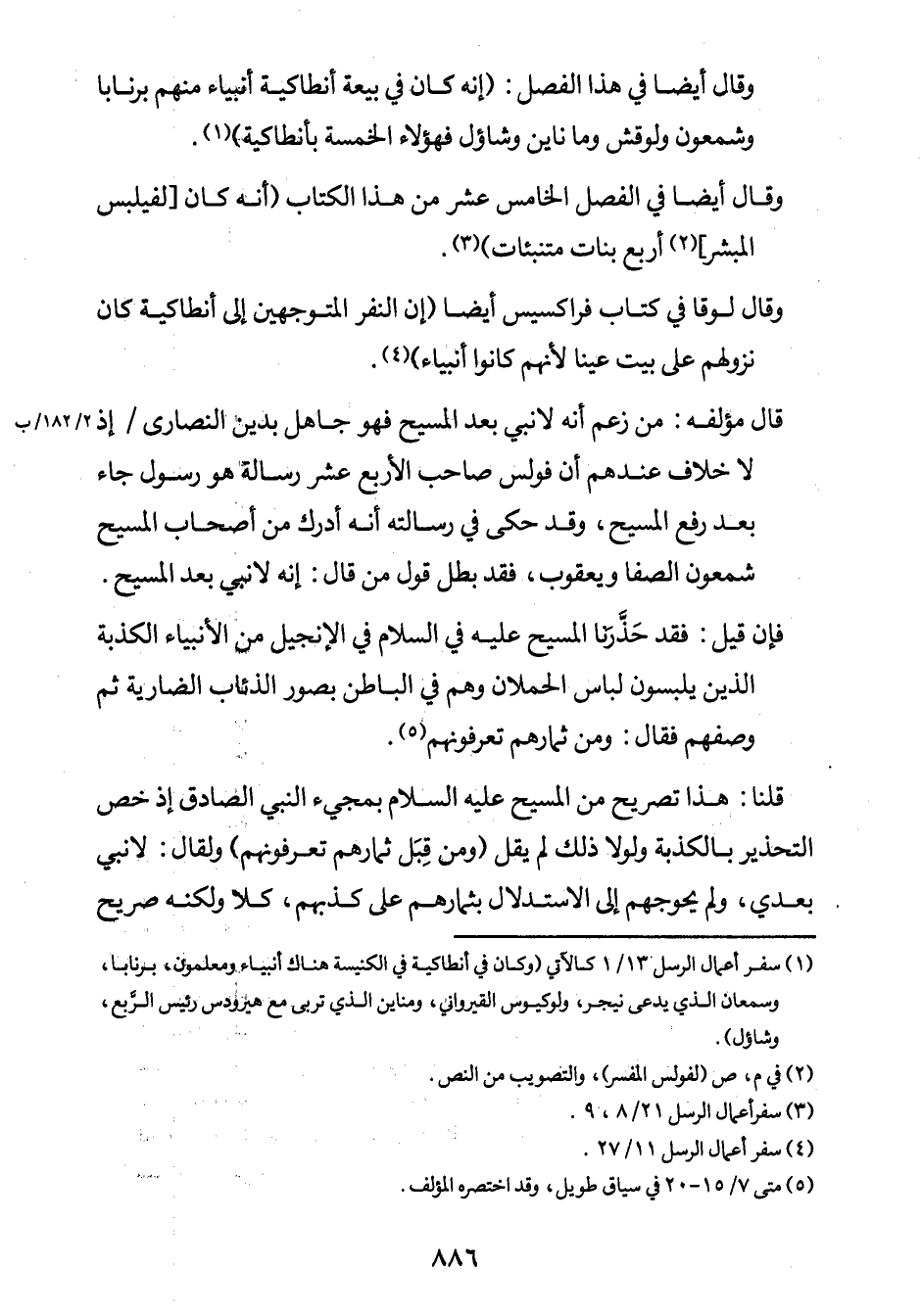 وقال أيضاً في هذا الفصل: "إنه كان في بيعة أنطاكية أنبياء منهم: برنابا وشمعون ولوقش وما ناين وشاؤل فهؤلاء الخمسة بأنطاكية"1.