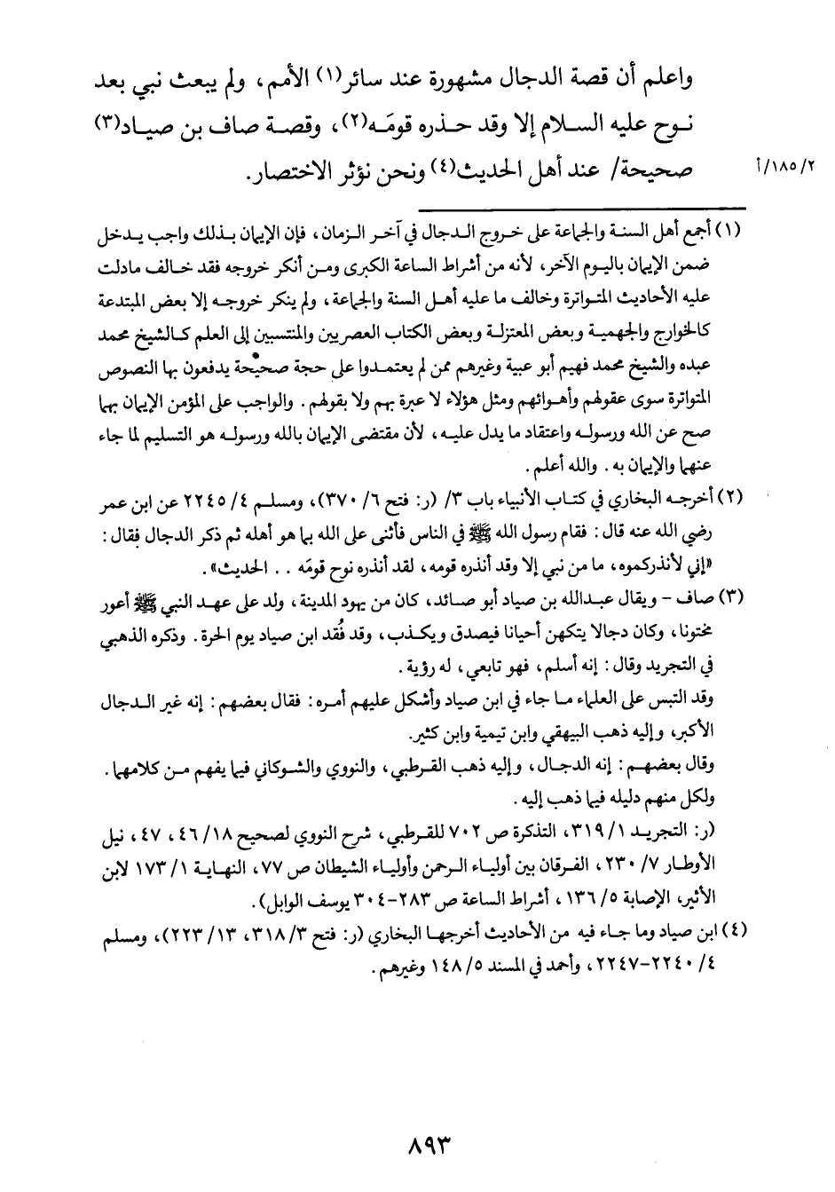 واعلم أن قصة الدجال مشهورة عند سائر1 الأمم، ولم يبعث نبي بعد نوح عليه السلام إلاّ وقد حذّره قومَه2، وقصة صاف3 بن صياد صحيحة / (2/185/أ) عند أهل الحديث4 ونحن نؤثر الاختصار.