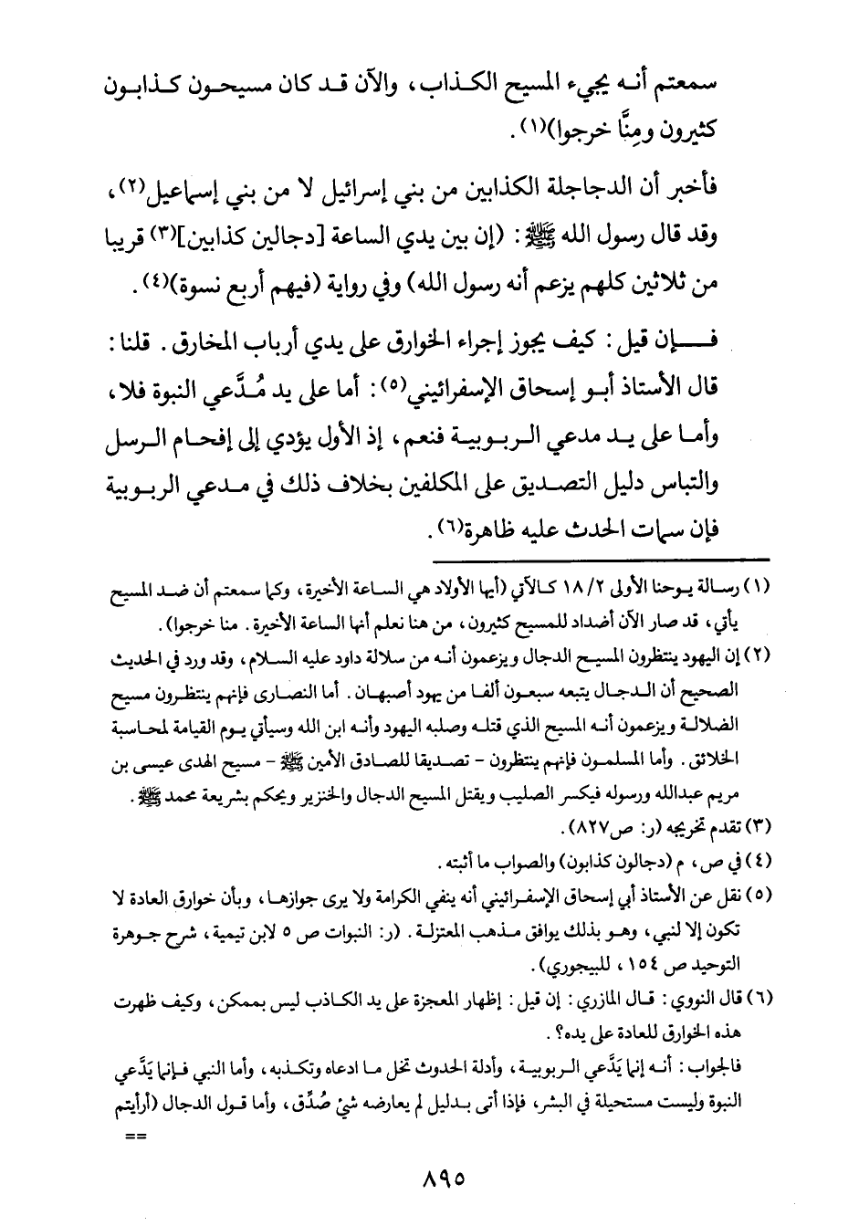 6 قال النووي: "قال المازري: إن قيل: إظهار المعجزة على يد الكاذب ليس بممكن، وكيف ظهرت هذه الخوارق للعادة على يده؟