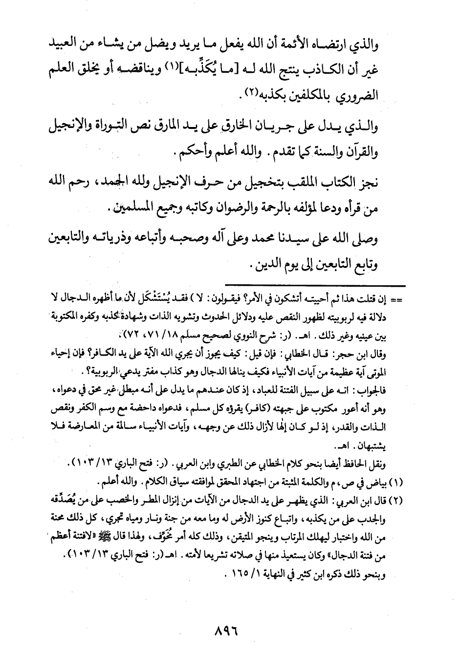 2 قال ابن العربي: "الذي يظهر على يد الدجال من الآيات من إنزال المطر والخصب على من يُصَدِّقه والجدب على من يكذبه، واتباع كنوز الأرض له، وما معه من جنة ونار ومياه تجري، كلّ ذلك محنة من الله واختبار ليهلك المرتاب وينجو المتيقن، وذلك كله أمرٌ مُخَوِّف، ولهذا قال صلى الله عليه وسلم: "لا فتنة أعظم من فتنة الدجال"، وكان يستعيذ منها في صلاته تشريعاً لأمته". اهـ. (ر: فتح الباري 13/103) .