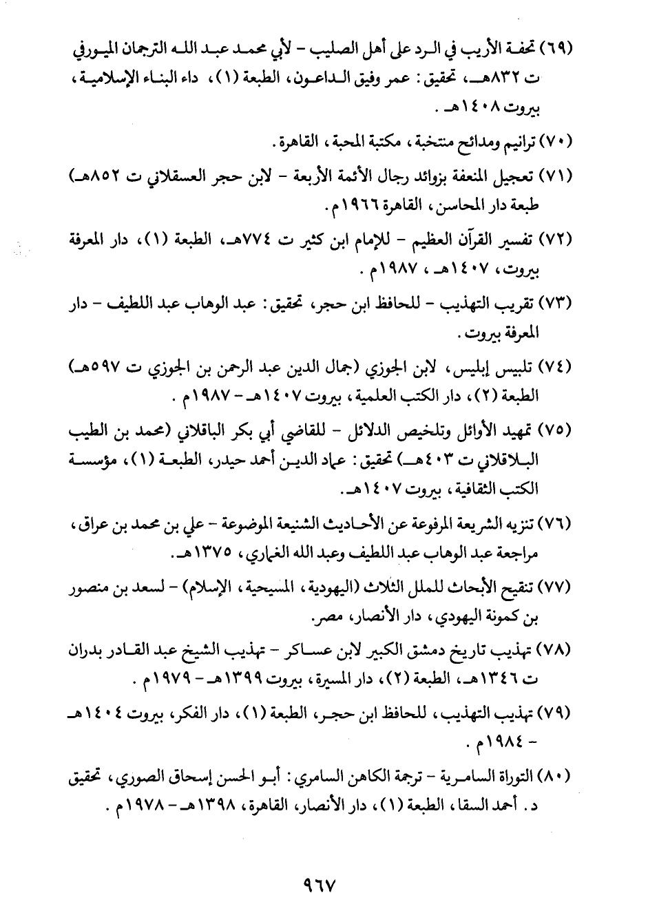 71- تعجيل المنعفة بزوائد رجال الأئمة الأربعة - لابن حجر العسقلاني ت 852هـ) ،طبعة دار المحاسن، القاهرة،1966م.