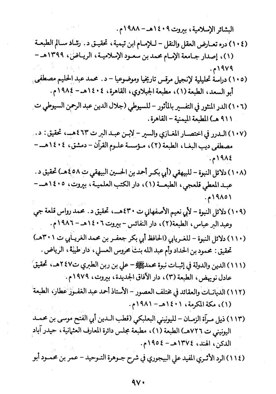 107- الدرر في اختصار المغازي والسير - لابن عبد البرّ ت 463هـ، تحقيق: د. مصطفى ديب البغا، الطبعة (2) ، مؤسسة علوم القرآن، دمشق، 1404هـ/ 1984م.