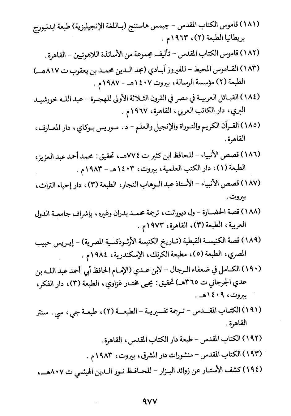 185- القرآن الكريم والتوراة والإنجيل والعلم - د. موريس بوكاي، دار المعارف، القاهرة.