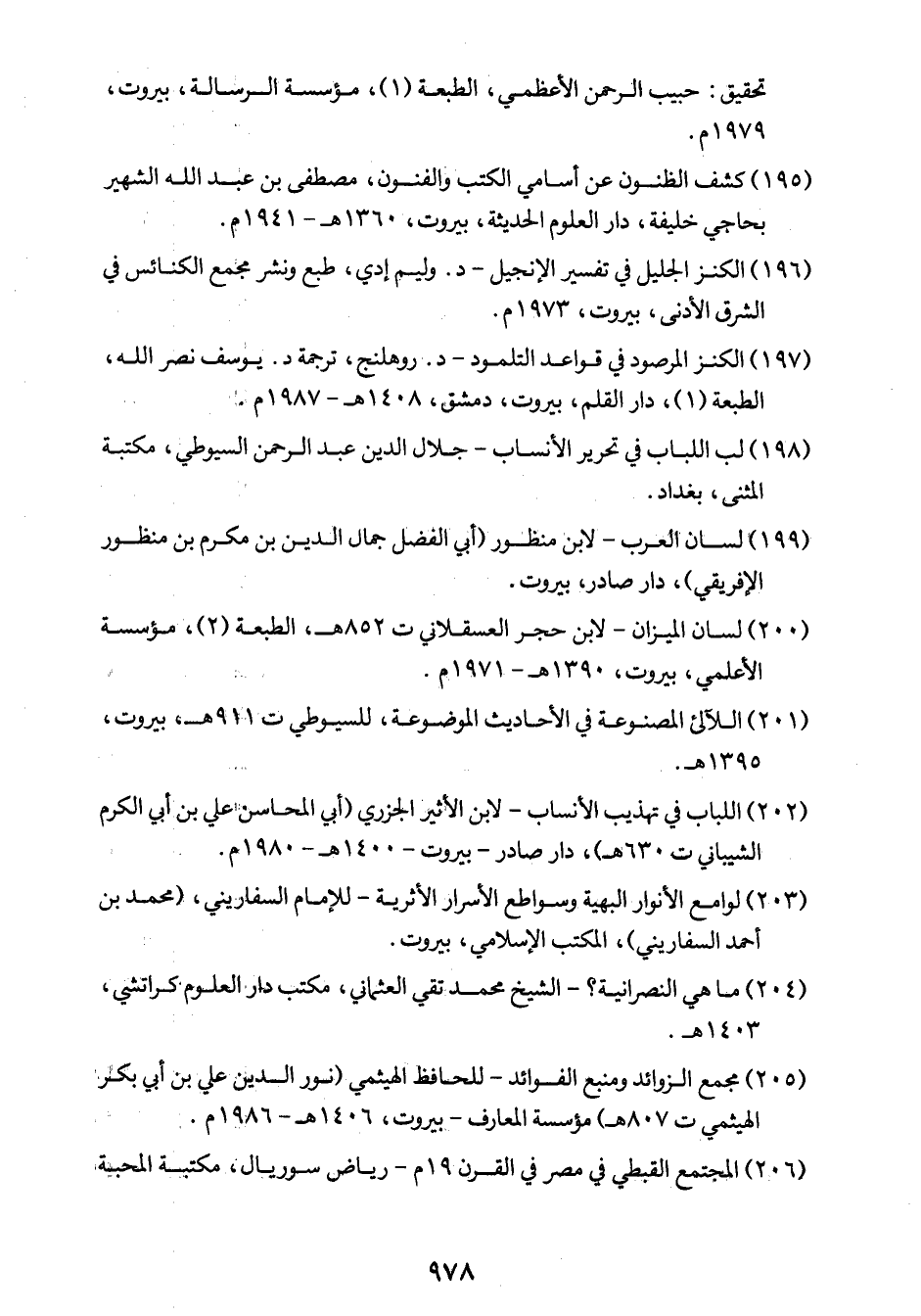 195- كشف الظنون عن أسامي الكتب والفنون، مصطفى بن عبد الله الشهير بـ (حاجي خليفة) ، دار العلوم الحديثة، بيروت، 1360هـ/ 1941م.