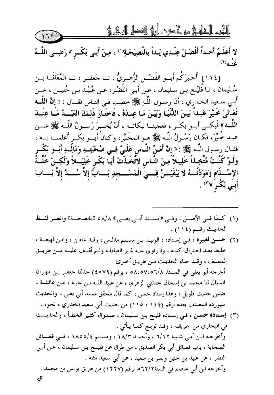 114 - أَخْبَرَكُمْ أَبُو الْفَضْلِ الزُّهْرِيُّ، نا جَعْفَرٌ، نا الْمُعَافَى بْنُ سُلَيْمَانَ، نا فُلَيْحُ بْنُ سُلَيْمَانَ، عَنْ أَبِي النَّضْرِ، عَنْ عُبَيْدِ بْنِ حُنَيْنٍ، عَنْ أَبِي سَعِيدٍ الْخُدْرِيِّ، أَنَّ رَسُولَ اللَّهِ صَلَّى اللَّهُ عَلَيْهِ وَسَلَّمَ خَطَبَ فِي النَّاسِ , فَقَالَ: «إِنَّ اللَّهَ تَعَالَى خَيَّرَ عَبْدًا بَيْنَ الدُّنْيَا وَبَيْنَ مَا عِنْدَهُ، فَاخْتَارَ ذَلِكَ الْعَبْدُ مَا عِنْدَ اللَّهِ» فَبَكَى أَبُو بَكْرٍ، فَعَجِبْنَا لِبُكَائِهِ، أَنْ يُخْبِرَ رَسُولُ اللَّهِ صَلَّى اللَّهُ عَلَيْهِ وَسَلَّمَ عَنْ عَبْدٍ خُيِّرَ، فَكَانَ رَسُولُ اللَّهِ صَلَّى اللَّهُ عَلَيْهِ وَسَلَّمَ هُوَ الْمُخَيَّرُ، وَكَانَ أَبُو بَكْرٍ أَعْلَمَنَا بِهِ، فَقَالَ رَسُولُ اللَّهِ صَلَّى اللَّهُ عَلَيْهِ وَسَلَّمَ: «إِنَّ أَمَنَّ النَّاسِ عَلَيَّ فِي صُحْبَتِهِ وَمَالِهِ أَبُو بَكْرٍ , وَلَوْ كُنْتُ مُتَّخِذًا خَلِيلًا مِنَ النَّاسِ لَاتَّخَذْتُ أَبَا بَكْرٍ خَلِيلًا , وَلَكِنْ خُلَّةُ الْإِسْلَامِ وَمَوَدَّتُهُ لَا يَبْقَيَّنَ فِي الْمَسْجِدِ بَابٌ إِلَّا سُدَّ إِلَّا بَابُ أَبِي بَكْرٍ»