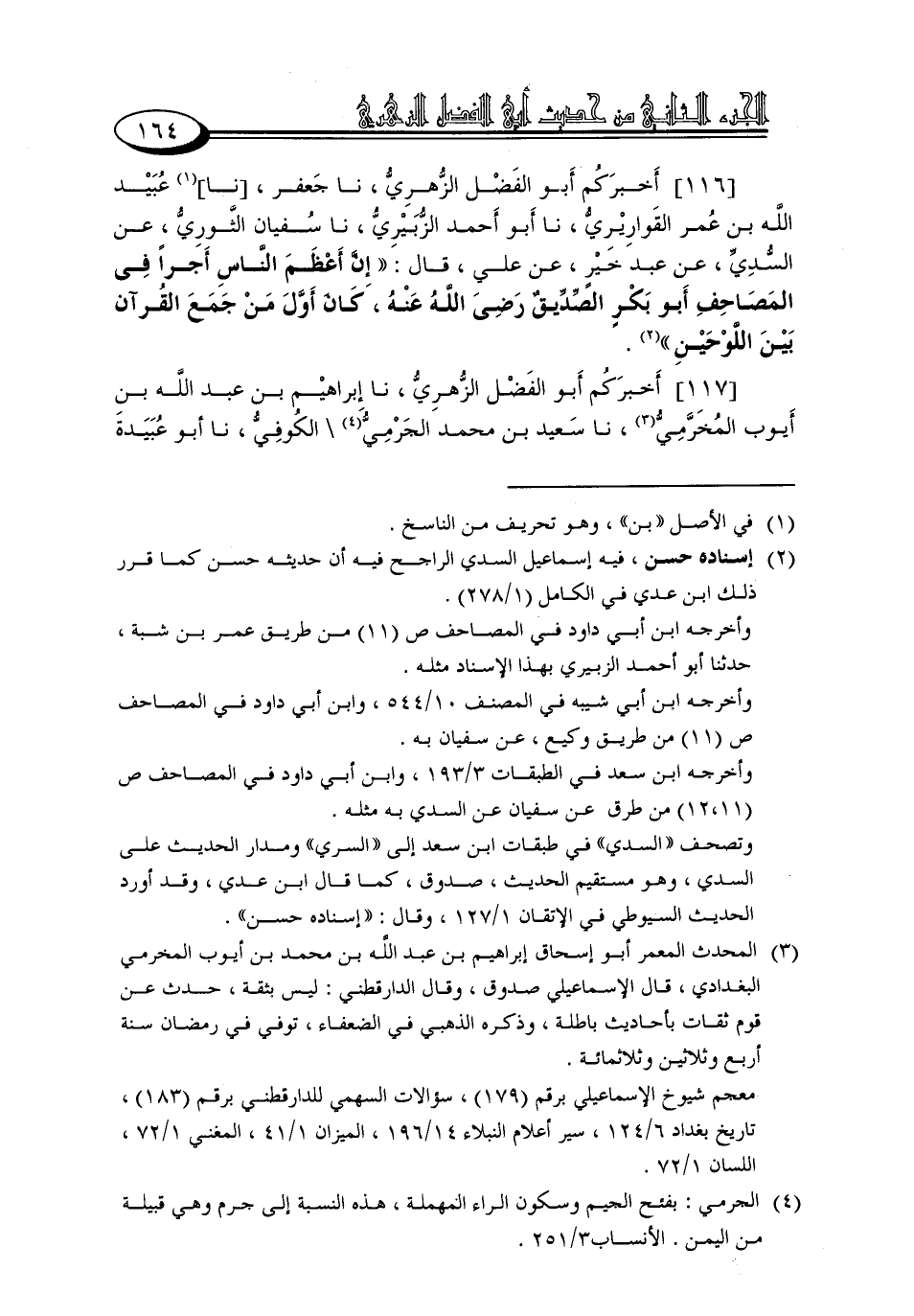 116 - أَخْبَرَكُمْ أَبُو الْفَضْلِ الزُّهْرِيُّ، نا جَعْفَرٌ، نا عُبَيْدُ اللَّهِ بْنُ عُمَرَ الْقَوَارِيرِيُّ، نا أَبُو أَحْمَدَ الزُّبَيْرِيُّ، نا سُفْيَانُ الثَّوْرِيُّ، عَنِ السُّدِّيِّ، عَنْ عَبْدِ خَيْرٍ، عَنْ عَلِيٍّ، قَالَ: «إِنَّ أَعْظَمَ النَّاسِ أَجْرًا فِي الْمَصَاحِفِ أَبُو بَكْرٍ الصِّدِّيقُ رَضِيَ اللَّهُ عَنْهُ، كَانَ أَوَّلَ مَنْ جَمَعَ الْقُرْآنَ بَيْنَ اللَّوْحَيْنِ»