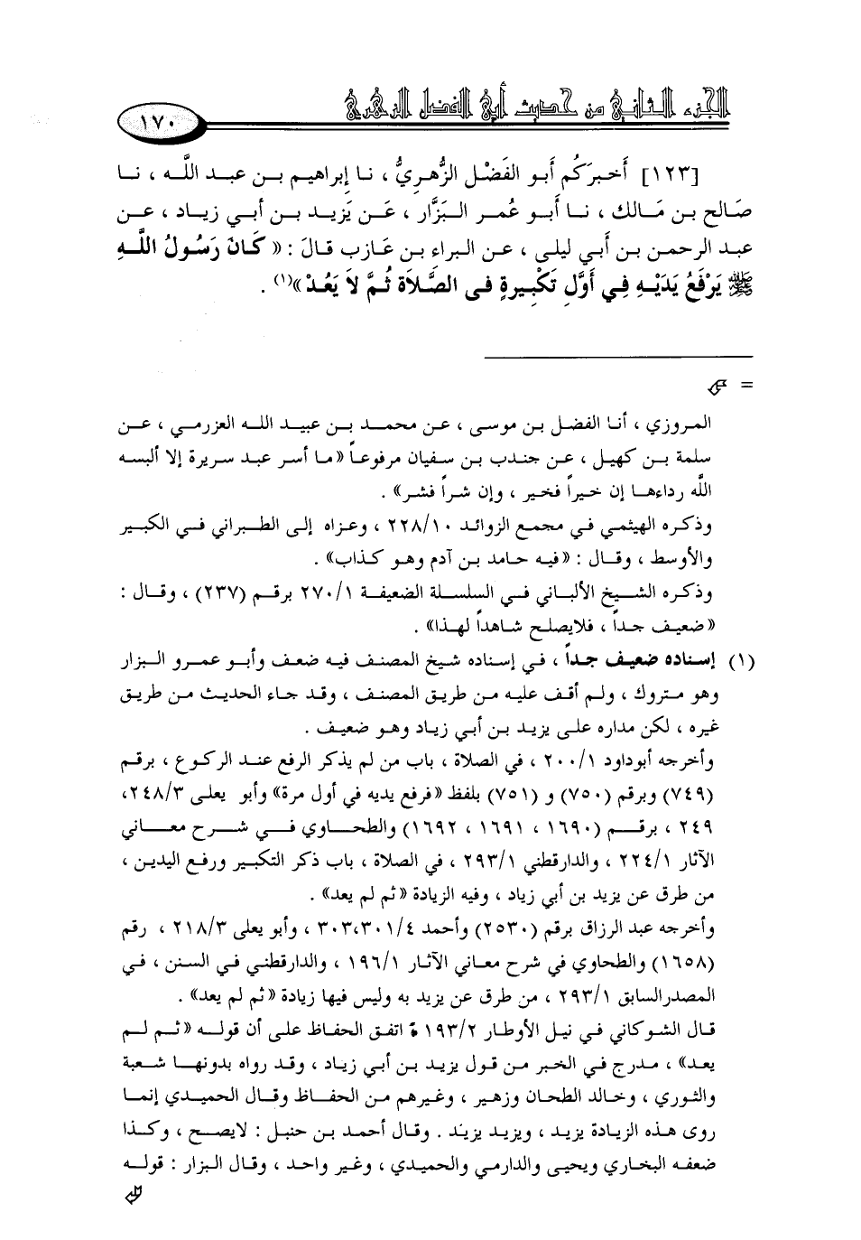 123 - أَخْبَرَكُمْ أَبُو الْفَضْلِ الزُّهْرِيُّ، نا إِبْرَاهِيمُ بْنُ عَبْدِ اللَّهِ، نا صَالِحُ بْنُ مَالِكٍ، نا أَبُو عُمَرَ الْبَزَّارُ، عَنْ يَزِيدَ بْنِ أَبِي زِيَادٍ، عَنْ عَبْدِ الرَّحْمَنِ بْنِ أَبِي لَيْلَى، عَنِ الْبَرَاءِ بْنِ عَازِبٍ: «كَانَ رَسُولُ اللَّهِ صَلَّى اللَّهُ عَلَيْهِ وَسَلَّمَ يَرْفَعُ يَدَيْهِ فِي أَوَّلِ تَكْبِيرَةٍ فِي الصَّلَاةِ ثُمَّ لَا يَعُودُ»