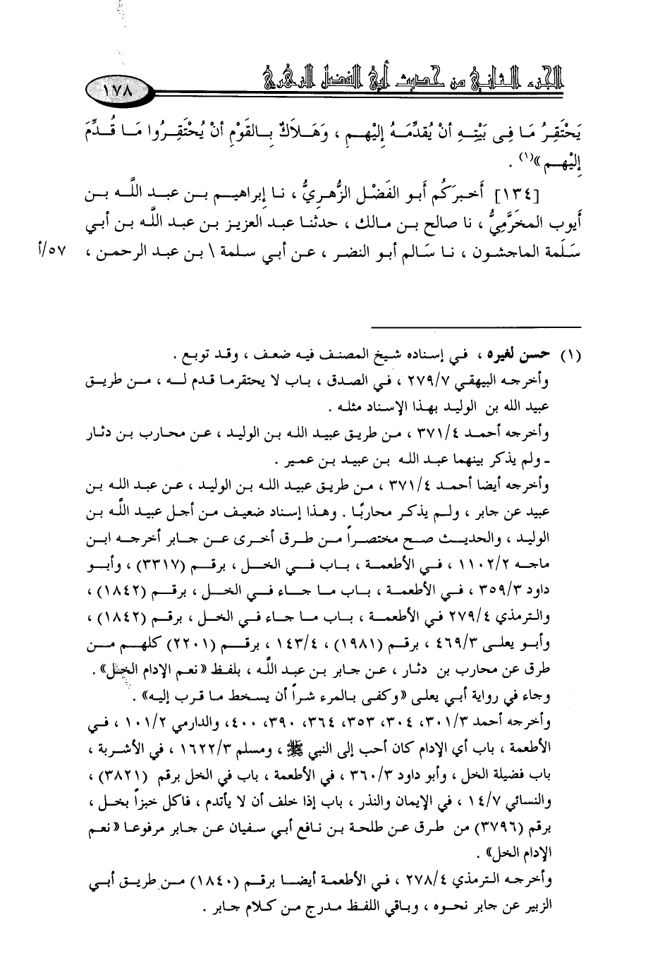 134 - أَخْبَرَكُمْ أَبُو الْفَضْلِ الزُّهْرِيُّ، نا إِبْرَاهِيمُ بْنُ عَبْدِ اللَّهِ بْنِ أَيُّوبَ الْمَخْرَمِيُّ، نا صَالِحُ بْنُ مَالِكٍ، حَدَّثَنَا عَبْدُ الْعَزِيزِ بْنُ عَبْدِ اللَّهِ بْنِ أَبِي سَلَمَةَ الْمَاجِشُونُ، نا سَالِمٌ أَبُو النَّضْرِ، عَنْ أَبِي سَلَمَةَ بْنِ عَبْدِ الرَّحْمَنِ، -[179]- عَنْ عَائِشَةَ، قَالَتْ: «صُلِّيَ عَلَى سُهَيْلِ ابْنِ بَيْضَاءَ فِي الْمَسْجِدِ»