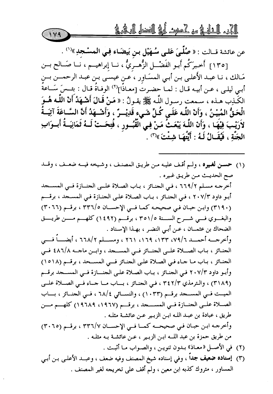 135 - أَخْبَرَكُمْ أَبُو الْفَضْلِ الزُّهْرِيُّ، نا إِبْرَاهِيمُ، نا صَالِحُ بْنُ مَالِكٍ، نا عَبْدُ الْأَعْلَى بْنُ أَبِي الْمُسَاوِرِ، عَنْ عِيسَى بْنِ عَبْدِ الرَّحْمَنِ بْنِ أَبِي لَيْلَى، عَنْ أَبِيهِ، قَالَ: لَمَّا حَضَرَتْ مُعَاذًا الْوَفَاةُ قَالَ: بِئْسَ سَاعَةُ الْكَذِبِ هَذِهِ، سَمِعْتُ رَسُولَ اللَّهِ صَلَّى اللَّهُ عَلَيْهِ وَسَلَّمَ يَقُولُ: " مَنْ قَالَ: أَشْهَدُ أَنَّ اللَّهَ هُوَ الْحَقُّ الْمُبِينُ، وَأَنَّ اللَّهَ عَلَى كُلِّ شَيْءٍ قَدِيرٌ، وَأَشْهَدُ أَنَّ السَّاعَةَ آتِيَةٌ لَا رَيْبَ فِيهَا، وَأَنَّ اللَّهَ يَبْعَثُ مَنْ فِي الْقُبُورِ، فُتِحَتْ لَهُ ثَمَانِيَةُ أَبْوَابٍ فِي الْجَنَّةِ، فَيُقَالُ لَهُ: أَيَّتُهَا شِئْتَ "