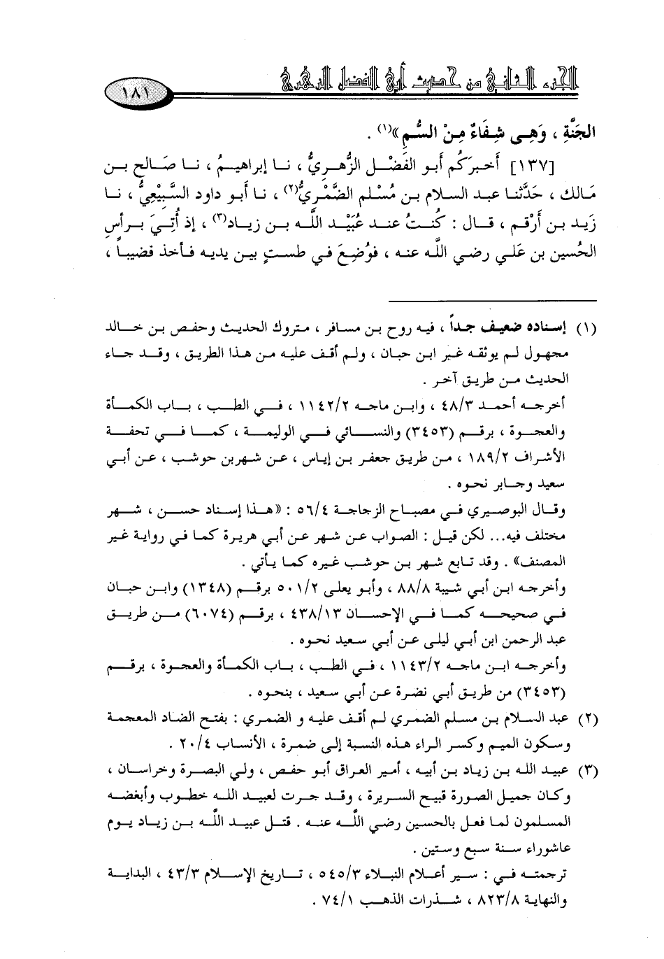137 - أَخْبَرَكُمْ أَبُو الْفَضْلِ الزُّهْرِيُّ، نا إِبْرَاهِيمُ، نا صَالِحُ بْنُ مَالِكٍ، حَدَّثَنَا عَبْدُ السَّلَامِ بْنُ مُسْلِمٍ الضَّمْرِيُّ، نا أَبُو دَاوُدَ السَّبِيعِيُّ، نا زَيْدُ بْنُ أَرْقَمَ، قَالَ: كُنْتُ عِنْدَ عُبَيْدِ اللَّهِ بْنِ زِيَادٍ، إِذْ أُتِيَ بِرَأْسِ الْحُسَيْنِ بْنِ عَلِيٍّ رَضِيَ اللَّهُ عَنْهُ، فَوُضِعَ فِي طَسْتٍ بَيْنَ يَدَيْهِ , فَأَخَذَ قَضِيبًا، -[182]- فَجَعَلَ يَفْتُرُ بِهِ عَنْ شَفَتِهِ وَعَنْ أَسْنَانِهِ، فَلَمْ أَرَ ثَغْرًا قَطُّ كَانَ أَحْسَنَ مِنْهُ كَأَنَّهُ الدُّرُّ، فَلَمْ أَتَمَالَكْ أَنْ رَفَعْتُ صَوْتِي بِالْبُكَاءِ، فَقَالَ: مَا يُبْكِيكَ أَيُّهَا الشَّيْخُ؟ قَالَ: يُبْكِينِي رُبَّمَا رَأَيْتُ رَسُولَ اللَّهِ صَلَّى اللَّهُ عَلَيْهِ وَسَلَّمَ يَمُصُّ مَوْضِعَ هَذَا الْقَضِيبِ، وَيَلْثُمُهُ , وَهُوَ يَقُولُ: «اللَّهُمَّ , إِنِّي أُحِبُّهُ فَأَحِبَّهُ»