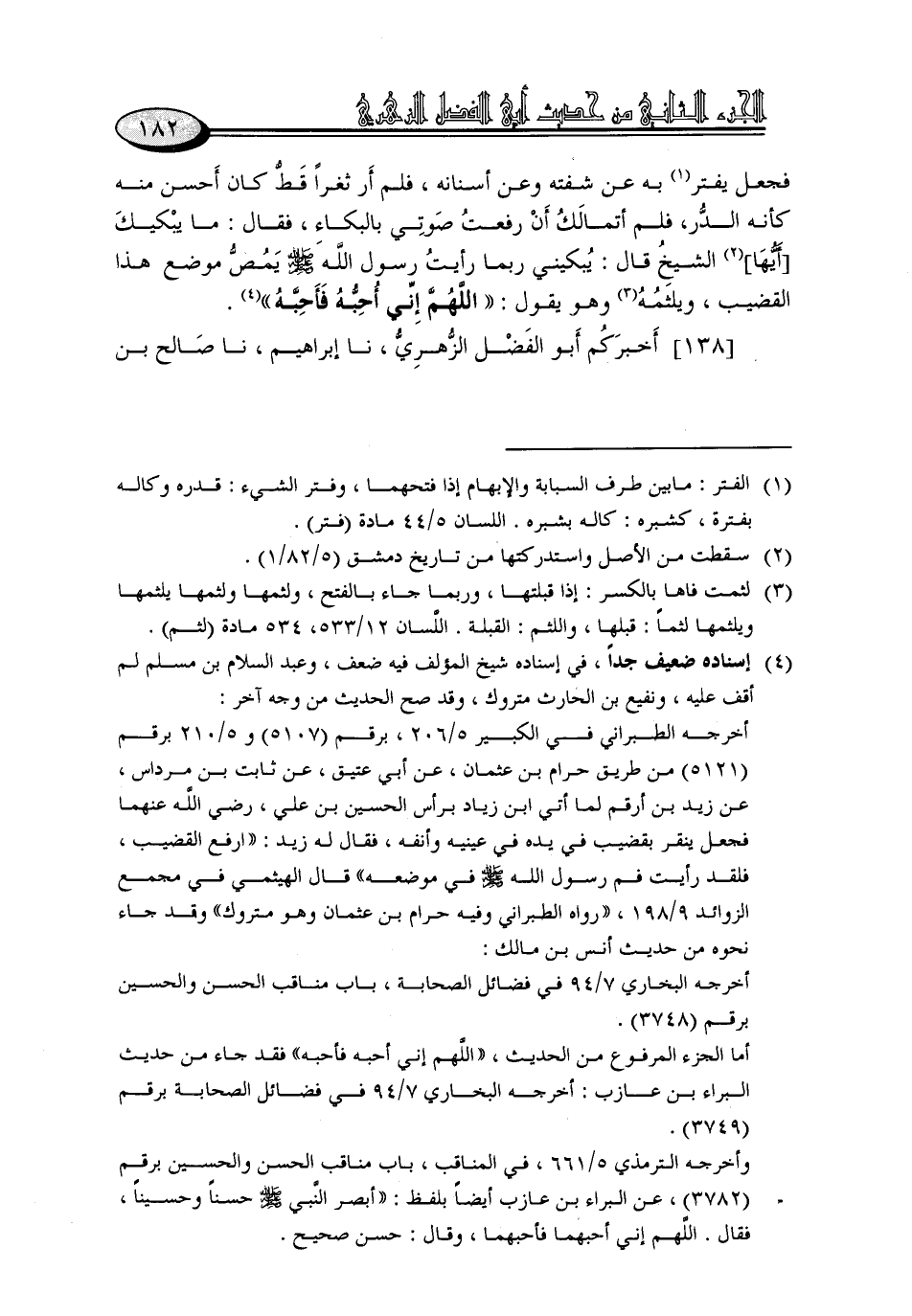 138 - أَخْبَرَكُمْ أَبُو الْفَضْلِ الزُّهْرِيُّ، نا إِبْرَاهِيمُ، نا صَالِحُ بْنُ -[183]- مَالِكٍ، نا أَبُو عُبَيْدَةَ النَّاجِيُّ، عَنْ مُحَمَّدِ بْنِ سِيرِينَ، أَظُنُّهُ عَنْ أَبِي هُرَيْرَةَ، قَالَ: لَدَغَتِ النَّبِيَّ صَلَّى اللَّهُ عَلَيْهِ وَسَلَّمَ عَقْرَبٌ، فَقَالَ: «مَا لَهَا لَعَنَهَا اللَّهُ، لَوْ كَانَتْ تَارِكَةً أَحَدًا تَرَكَتِ النَّبِيَّ صَلَّى اللَّهُ عَلَيْهِ وَسَلَّمَ»