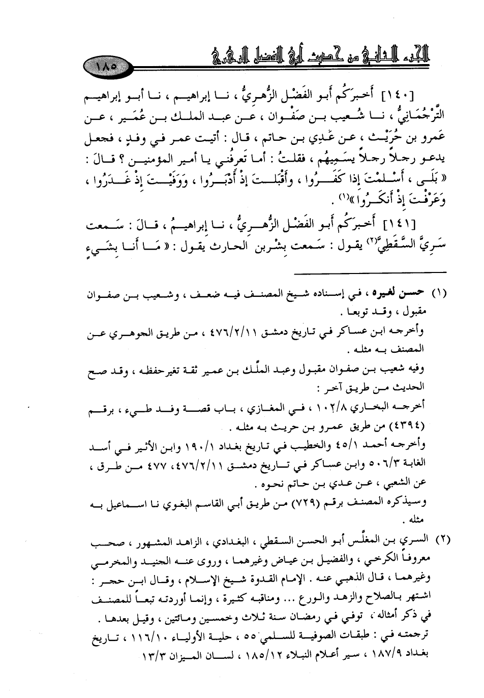 141 - أَخْبَرَكُمْ أَبُو الْفَضْلِ الزُّهْرِيُّ، نا إِبْرَاهِيمُ، قَالَ: سَمِعْتُ سَرِيَّ السَّقْطِيَّ يَقُولُ: سَمِعْتُ بِشْرَ بْنَ الْحَارِثِ يَقُولُ: «مَا أَنَا بِشَيْءٍ -[186]- مِنْ عَمَلِي أَوْثَقُ مِنِّي بِحُبِّ أَصْحَابِ مُحَمَّدٍ صَلَّى اللَّهُ عَلَيْهِ وَسَلَّمَ»