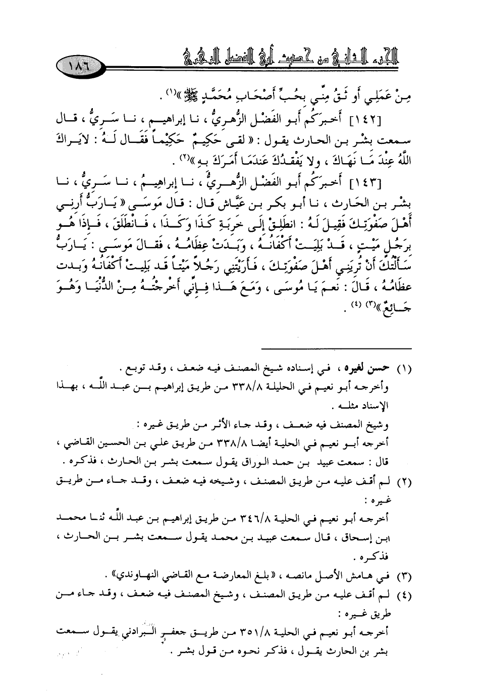 143 - أَخْبَرَكُمْ أَبُو الْفَضْلِ الزُّهْرِيُّ، نا إِبْرَاهِيمُ، نا سَرِيُّ، نا بِشْرُ بْنُ الْحَارِثِ، نا أَبُو بَكْرِ بْنُ عَيَّاشِ، قَالَ: قَالَ مُوسَى: " يَا رَبِّ , أَرِنِي أَهْلَ صَفْوَتِكَ فَقِيلَ لَهُ: انْطَلِقْ إِلَى خَرِبَةِ كَذَا وَكَذَا، فَانْطَلَقَ، فَإِذَا هُوَ بِرَجُلٍ مَيِّتٍ، قَدْ بَلِيَتْ أَكْفَانُهُ، وَبَدَتْ عِظَامُهُ، فَقَالَ مُوسَى: يَا رَبِّ , سَأَلْتُكَ أَنْ تُرِيَنِي أَهْلَ صَفْوَتِكَ، فَأَرَيْتَنِي رَجُلًا مَيِّتًا قَدْ بَلِيَتْ أَكْفَانُهُ , وَبَدَتْ عِظَامُهُ، قَالَ: نَعَمْ يَا مُوسَى، وَمَعَ هَذَا فَإِنِّي أَخْرَجْتُهُ مِنَ الدُّنْيَا وَهُوَ جَائِعٌ "