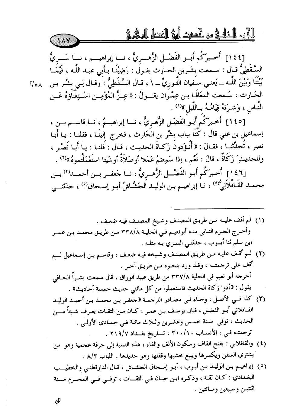 144 - أَخْبَرَكُمْ أَبُو الْفَضْلِ الزُّهْرِيُّ، نا إِبْرَاهِيمُ، نا سَرِيُّ السَّقْطِيُّ، قَالَ: سَمِعْتُ بِشْرَ بْنَ الْحَارِثِ، يَقُولُ: رَضِينَا بِأَبِي عَبْدِ اللَّهِ، فِيمَا بَيْنَنَا وَبَيْنَ اللَّهِ - يَعْنِي سُفْيَانَ الثَّوْرِيَّ -، قَالَ السَّقْطِيُّ: وَقَالَ لِي بِشْرُ بْنُ الْحَارِثِ، سَمِعْتُ الْمُعَافَى بْنَ عِمْرَانَ يَقُولُ: " عِزُّ الْمُؤْمِنِ اسْتِغْنَاؤُهُ عَنِ النَّاسِ، وَشَرَفُهُ قِيَامُهُ بِاللَّيْلِ