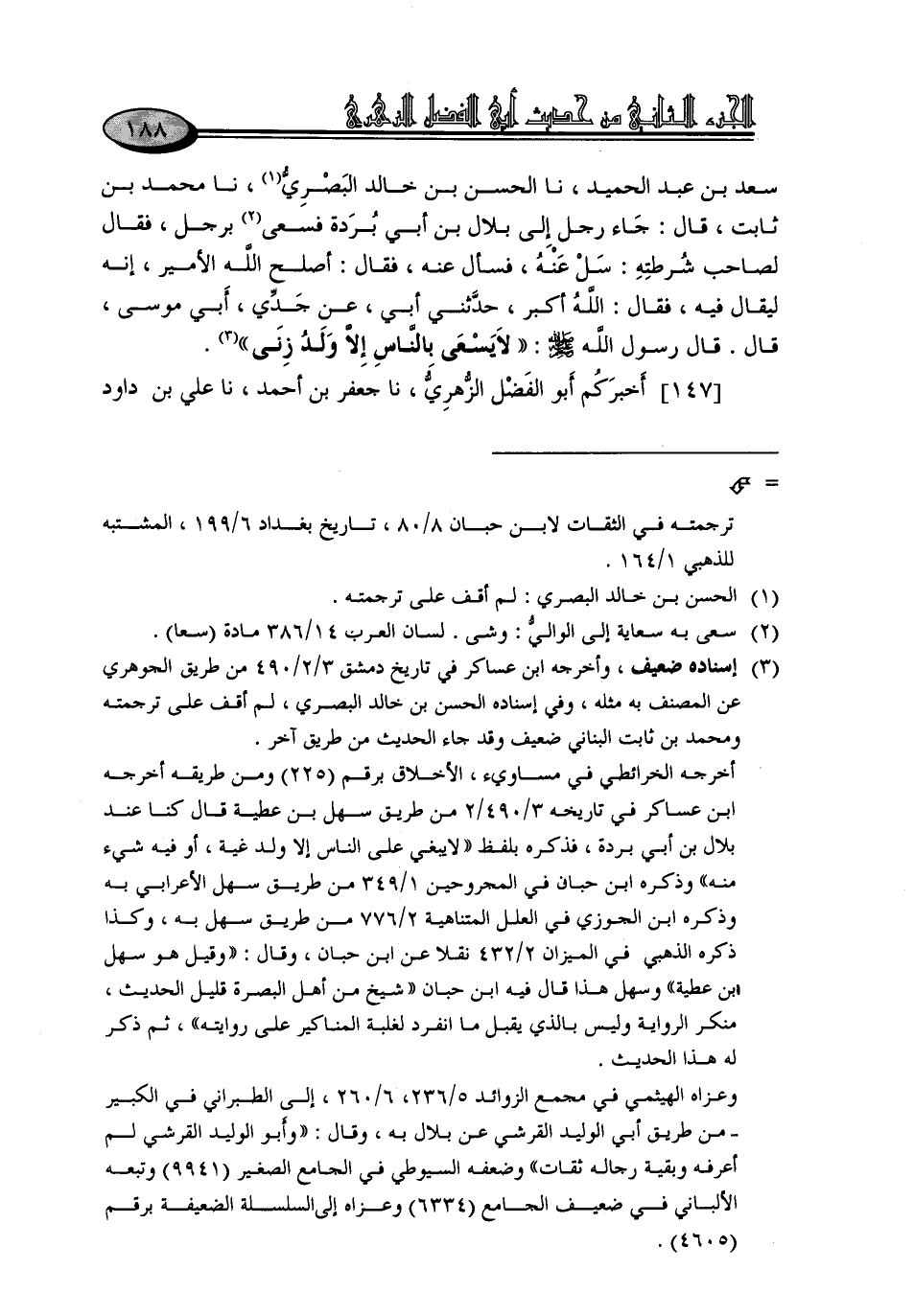 147 - أَخْبَرَكُمْ أَبُو الْفَضْلِ الزُّهْرِيُّ، نا جَعْفَرُ بْنُ أَحْمَدَ، نا عَلِيُّ بْنُ دَاوُدَ -[189]- الْقَنْطَرِيُّ، نا رَوْحُ بْنُ أَبِي سَعْدٍ، نا الْحَسَنُ بْنُ خَالِدٍ، عَنْ عَبْدِ الْعَزِيزِ بْنِ أَبِي رَوَّادٍ، عَنْ نَافِعٍ، عَنِ ابْنِ عُمَرَ، قَالَ: قَالَ رَسُولُ اللَّهِ صَلَّى اللَّهُ عَلَيْهِ وَسَلَّمَ: «مَنْ أَعْرَضَ بِوَجْهِ عَنْ صَاحِبِ بِدْعَةٍ بُغْضًا لَهُ، مَلَأَ اللَّهُ قَلْبَهُ يُمْنًا وَإِيمَانًا , وَمَنِ انْتَهَرَ صَاحِبَ بِدْعَةٍ أَمَّنَهُ اللَّهُ يَوْمَ الْفَزَعِ الْأَكْبَرِ، وَمَنْ أَهَانَ صَاحِبَ بِدْعَةٍ رَفَعَهُ اللَّهُ مِائَةَ دَرَجَةٍ، وَمَنْ سَلَّمَ عَلَى صَاحِبِ بِدْعَةٍ أَوْ لَقِيَهُ بِبُشْرٍ أَوِ اسْتَقْبَلَهُ بِمَا يَسُرُّهُ، فَقَدِ اسْتَخِفَّ بِمَا أَنْزَلَ اللَّهُ عَلَى مُحَمَّدٍ صَلَّى اللَّهُ عَلَيْهِ وَسَلَّمَ»