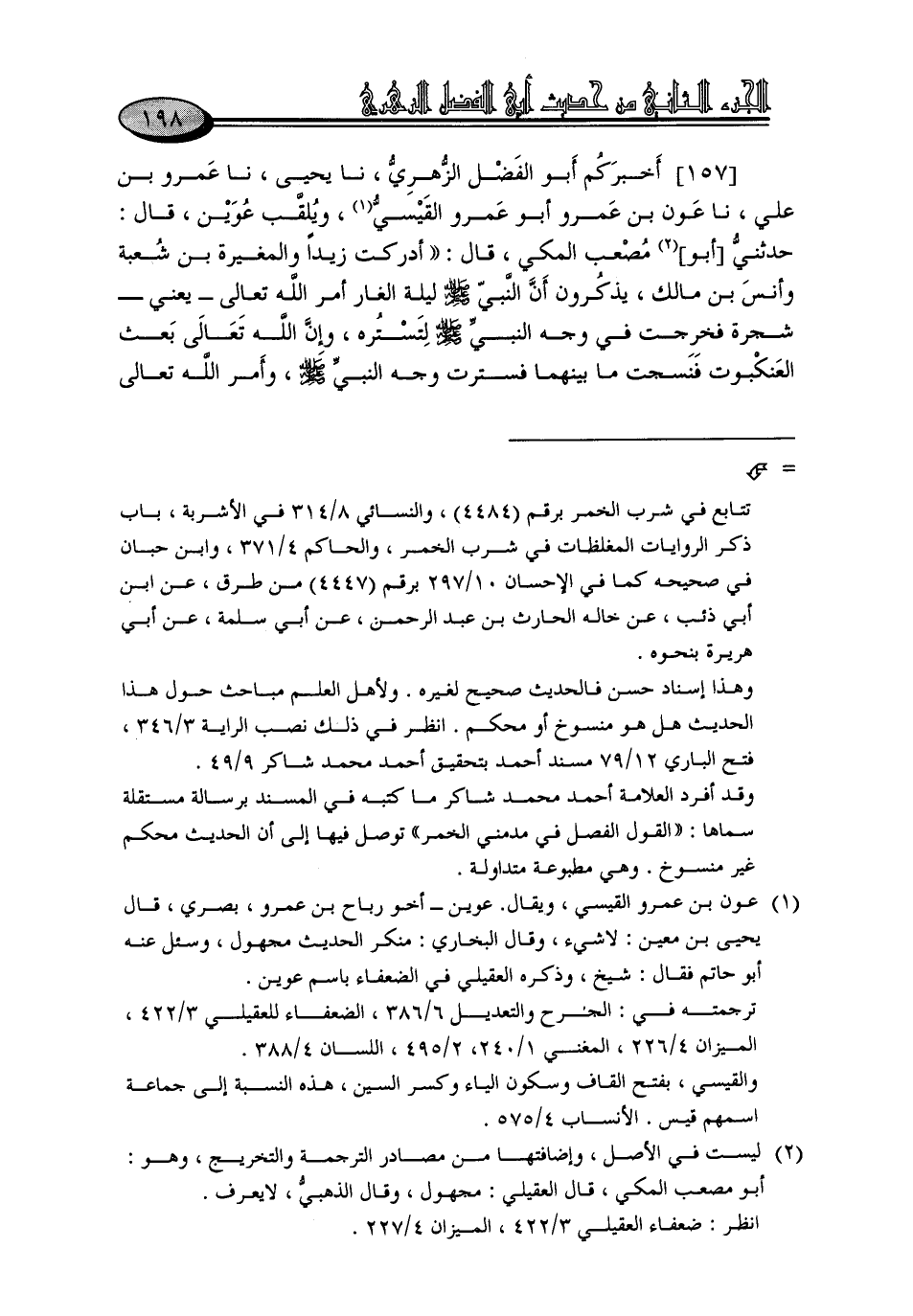 157 - أَخْبَرَكُمْ أَبُو الْفَضْلِ الزُّهْرِيُّ، نا يَحْيَى، نا عَمْرُو بْنُ عَلِيٍّ، نا عَوْنُ بْنُ عَمْرٍو أَبُو عَمْرٍو الْقَيْسِيُّ وَيُلَقَّبُ عُوَيْنٌ قَالَ: حَدَّثَنِي أَبُو مُصْعَبٍ الْمَكِّيُّ، قَالَ: أَدْرَكْتُ زَيْدًا , وَالْمُغِيرَةَ بْنَ شُعْبَةَ، وَأَنَسَ بْنَ مَالِكٍ، يَذْكُرُونَ أَنَّ النَّبِيَّ صَلَّى اللَّهُ عَلَيْهِ وَسَلَّمَ لَيْلَةَ الْغَارِ أَمَرَ اللَّهُ تَعَالَى - يَعْنِي شَجَرَةً - فَخَرَجَتْ فِي وَجْهِ النَّبِيِّ صَلَّى اللَّهُ عَلَيْهِ وَسَلَّمَ لِتَسْتُرَهُ، وَإِنَّ اللَّهَ تَعَالَى بَعَثَ الْعَنْكَبُوتَ , فَنَسَجَتْ مَا بَيْنَهُمَا , فَسَتَرَتْ وَجْهَ النَّبِيِّ صَلَّى اللَّهُ عَلَيْهِ وَسَلَّمَ، وَأَمَرَ اللَّهُ تَعَالَى -[199]- حَمَامَتَيْنِ , وَحْشِيَّتَيْنِ , فَأَقْبَلَا يَدُفَّانِ حَتَّى وَقَعَا بَيْنَ الْعَنْكَبُوتِ وَبَيْنَ الشَّجَرَةِ، وَأَقْبَلَتْ فِتْيَانُ قُرَيْشٍ مِنْ كُلِّ بَطْنٍ مِنْهُمْ رَجُلٌ، مَعَهُمْ عِصِيُّهُمْ وَقِسِيُّهُمْ وَمَزَادَاتُهُمْ، حَتَّى إِذَا كَانُوا مِنَ النَّبِيِّ صَلَّى اللَّهُ عَلَيْهِ وَسَلَّمَ عَلَى قَدْرِ مِائَتَيْ ذِرَاعٍ. قَالَ الدَّلِيلُ سُرَاقَةُ بْنُ مَالِكِ بْنِ جُعْشُمٍ الْمُدْلِجِيُّ: هَذَا الْحَجَرُ , ثُمَّ لَا أَدْرِي أَيْنَ وَضَعَ رِجْلَهُ، فَقَالَ الْفِتْيَانُ: أَنْتَ لَمْ تُخْطِئْ مُنْذُ اللَّيْلَةِ، حَتَّى إِذَا أَصْبَحْنَا قَالَ: انْظُرُوا فِي الْغَارِ، فَاسْتَقْدَمَ الْقَوْمَ فَتًى، حَتَّى إِذَا كَانُوا مِنَ النَّبِيِّ صَلَّى اللَّهُ عَلَيْهِ وَسَلَّمَ فِي قَدْرِ خَمْسِينَ ذِرَاعًا، فَإِذَا الْحَمَامَتَانِ، فَرَجَعَ، فَقَالُوا: مَا رَدَّكَ أَنْ تَنْظُرَ فِي الْغَارِ؟ قَالَ: رَأَيْتُ حَمَامَتَيْنِ وَحْشِيِّتَيْنِ بِفَمِ الْغَارِ، فَعَرَفْتُ أَنْ لَيْسَ فِيهِ أَحَدٌ، فَسَمِعَهَا النَّبِيُّ صَلَّى اللَّهُ عَلَيْهِ وَسَلَّمَ فَعَرَفَ أَنَّ اللَّهَ تَعَالَى قَدْ دَرَأَ عَنْهُمَا بِهِمَا، فَسَمَّتَ عَلَيْهِمَا، وَأَحْدَرَهُمَا اللَّهُ تَعَالَى إِلَى الْحَرَمِ , فَأَفْرَخَا عَلَى مَا تَرَى "