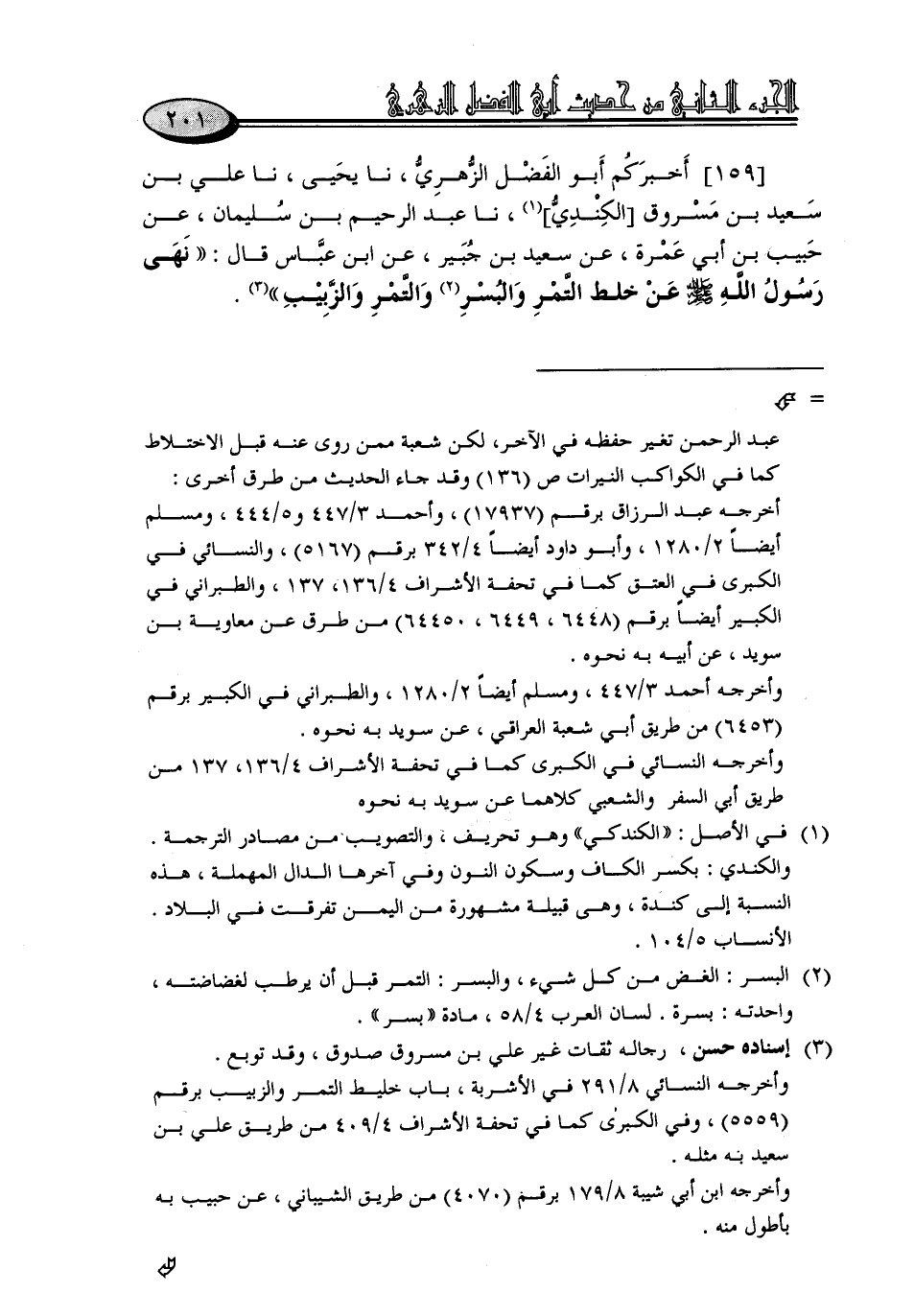 159 - أَخْبَرَكُمْ أَبُو الْفَضْلِ الزُّهْرِيُّ، نا يَحْيَى، نا عَلِيُّ بْنُ سَعِيدِ بْنِ مَسْرُوقٍ الْكِنْدِيُّ، نا عَبْدُ الرَّحِيمِ بْنُ سُلَيْمَانَ، عَنْ حَبِيبِ بْنِ أَبِي عَمْرَةَ، عَنْ سَعِيدِ بْنِ جُبَيْرٍ، عَنِ ابْنِ عَبَّاسٍ، قَالَ: «نَهَى رَسُولُ اللَّهِ صَلَّى اللَّهُ عَلَيْهِ وَسَلَّمَ عَنْ خَلْطِ التَّمْرِ وَالْبُسْرِ , وَالتَّمْرِ وَالزَّبِيبِ»