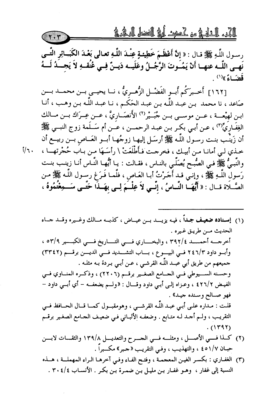 162 - أَخْبَرَكُمْ أَبُو الْفَضْلِ الزُّهْرِيُّ، نا يَحْيَى بْنُ مُحَمَّدِ بْنِ صَاعِدٍ، نا مُحَمَّدُ بْنُ عَبْدِ اللَّهِ بْنِ عَبْدِ الْحَكَمِ، نا عَبْدُ اللَّهِ بْنُ وَهْبٍ، أنا ابْنُ لَهِيعَةَ، عَنْ مُوسَى بْنِ جُبَيْرٍ الْأَنْصَارِيِّ، عَنْ عِرَاكِ بْنِ مَالِكٍ الْغِفَارِيِّ، عَنْ أَبِي بَكْرِ بْنِ عَبْدِ الرَّحْمَنِ، عَنْ أُمِّ سَلَمَةَ، زَوْجِ النَّبِيِّ صَلَّى اللَّهُ عَلَيْهِ وَسَلَّمَ أَنَّ زَيْنَبَ بِنْتَ رَسُولِ اللَّهِ صَلَّى اللَّهُ عَلَيْهِ وَسَلَّمَ أَرْسَلَ إِلَيْهَا زَوْجُهَا أَبُو الْعَاصِ بْنُ رَبِيعٍ أَنْ خُذِي لِي أَمَانًا مِنْ أَبِيكِ، فَخَرَجَتْ فَأَطْلَعَتْ رَأْسَهَا مِنْ بَابِ حُجْرَتِهَا، وَالنَّبِيُّ صَلَّى اللَّهُ عَلَيْهِ وَسَلَّمَ فِي الصُّبْحِ يُصَلِّي بِالنَّاسِ، فَقَالَتْ: يَا أَيُّهَا النَّاسُ , أَنَا زَيْنَبُ بِنْتُ رَسُولِ اللَّهِ صَلَّى اللَّهُ عَلَيْهِ وَسَلَّمَ، وَإِنِّي قَدْ أَجَرْتُ أَبَا الْعَاصِ، فَلَمَّا فَرَغَ رَسُولُ اللَّهِ صَلَّى اللَّهُ عَلَيْهِ وَسَلَّمَ مِنَ الصَّلَاةِ قَالَ: «أَيُّهَا النَّاسُ، إِنِّي لَا عِلْمَ لِي بِهَذَا حَتَّى سَمِعْتُمُوهُ، -[204]- أَلَا وَإِنَّهُ يُجِيرُ عَلَى النَّاسِ أَدْنَاهُمْ»